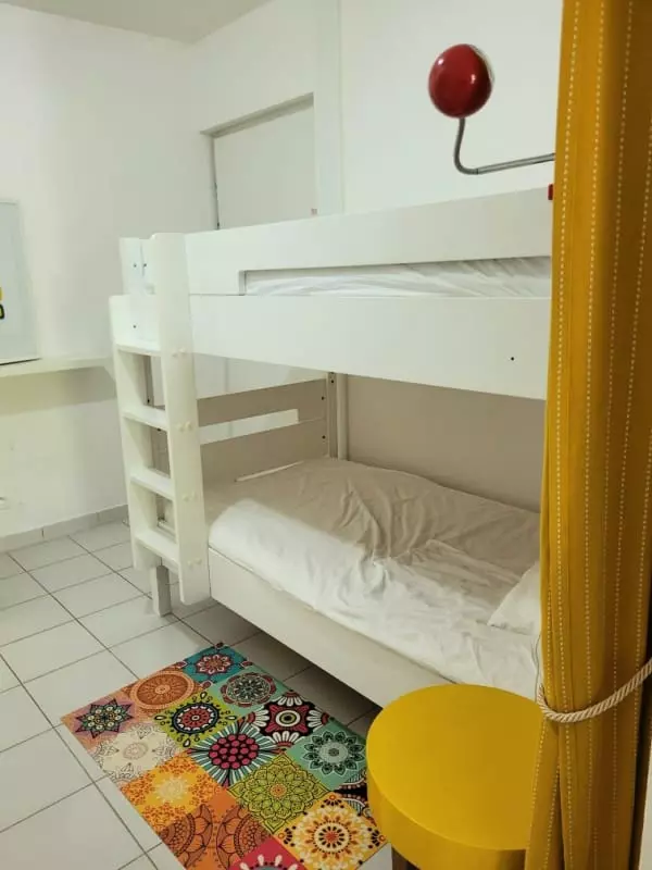 La pièce à vivre est composée d'un coin nuit avec un lit superposé ; un coin détente avec un canapé lit ; un coin-repas ; une cuisine toute équipée et une salle de douche.