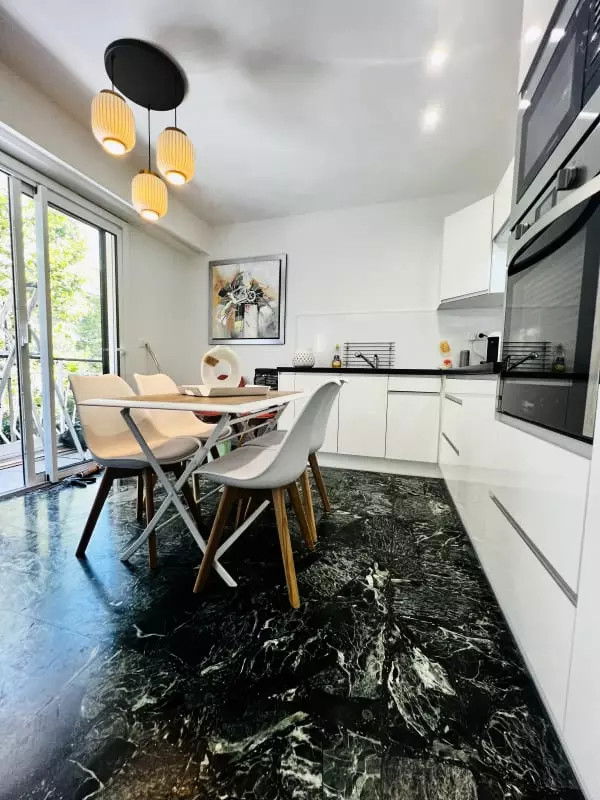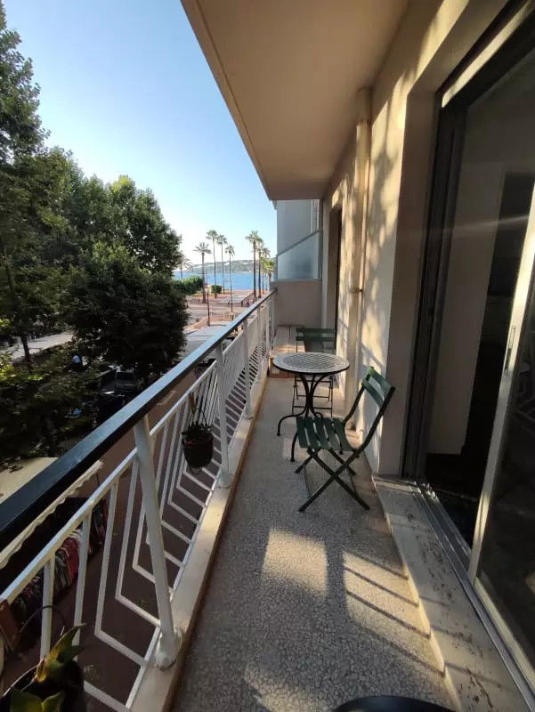 La cuisine et le séjour donnent tous les deux sur un balcon de 9 m2 offrant une vue dégagée sur la mer, le boulevard Albert 1er et les palmiers du bord de mer.
