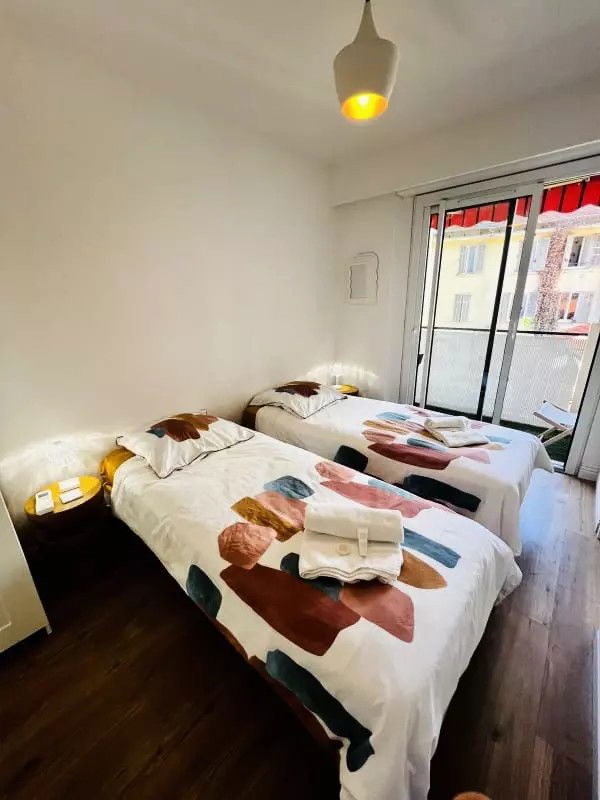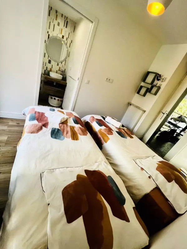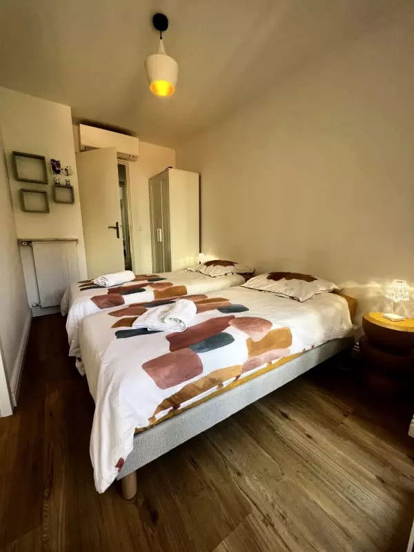 - Chambre 1 : deux lits simples (80x200cm), placard, climatisation, accès au balcon + salle de bain reliée à la chambre.