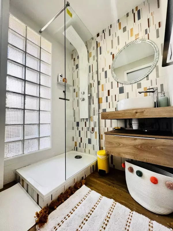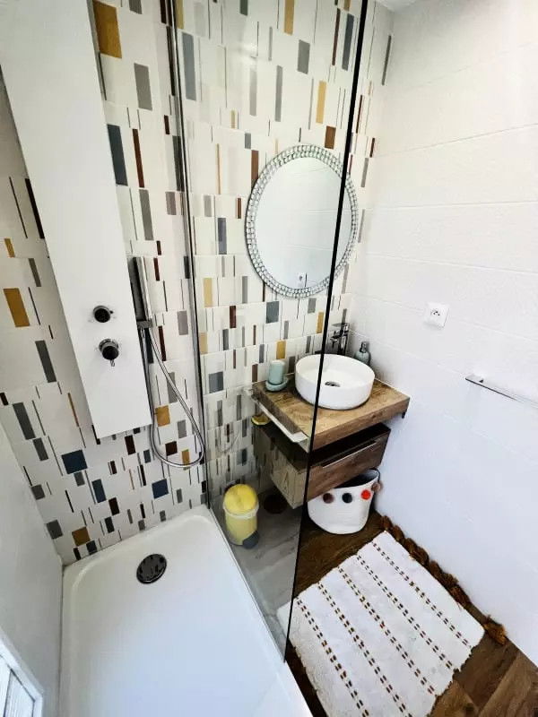 Cette salle de bain dispose d'une vasque et d'une douche.