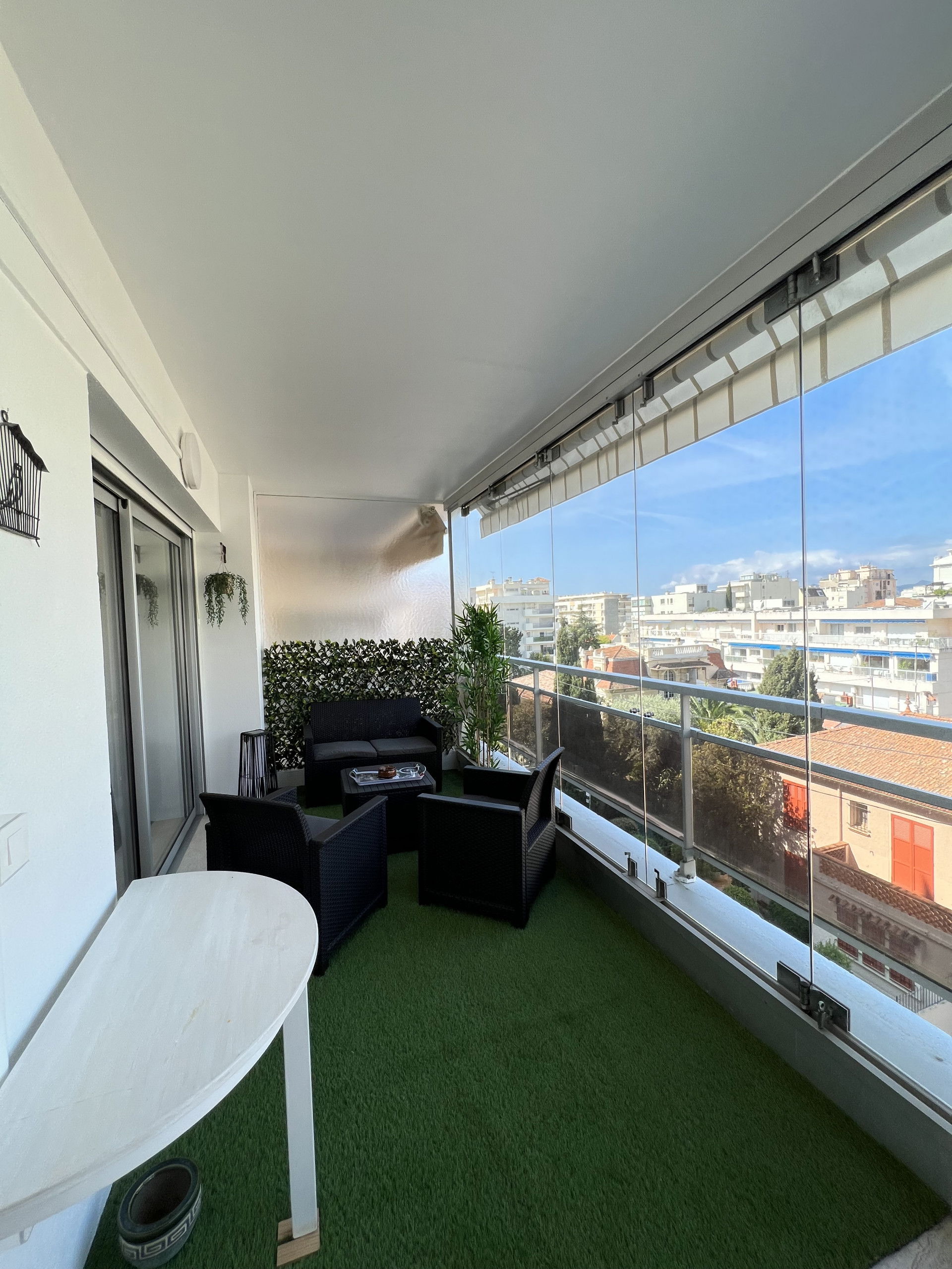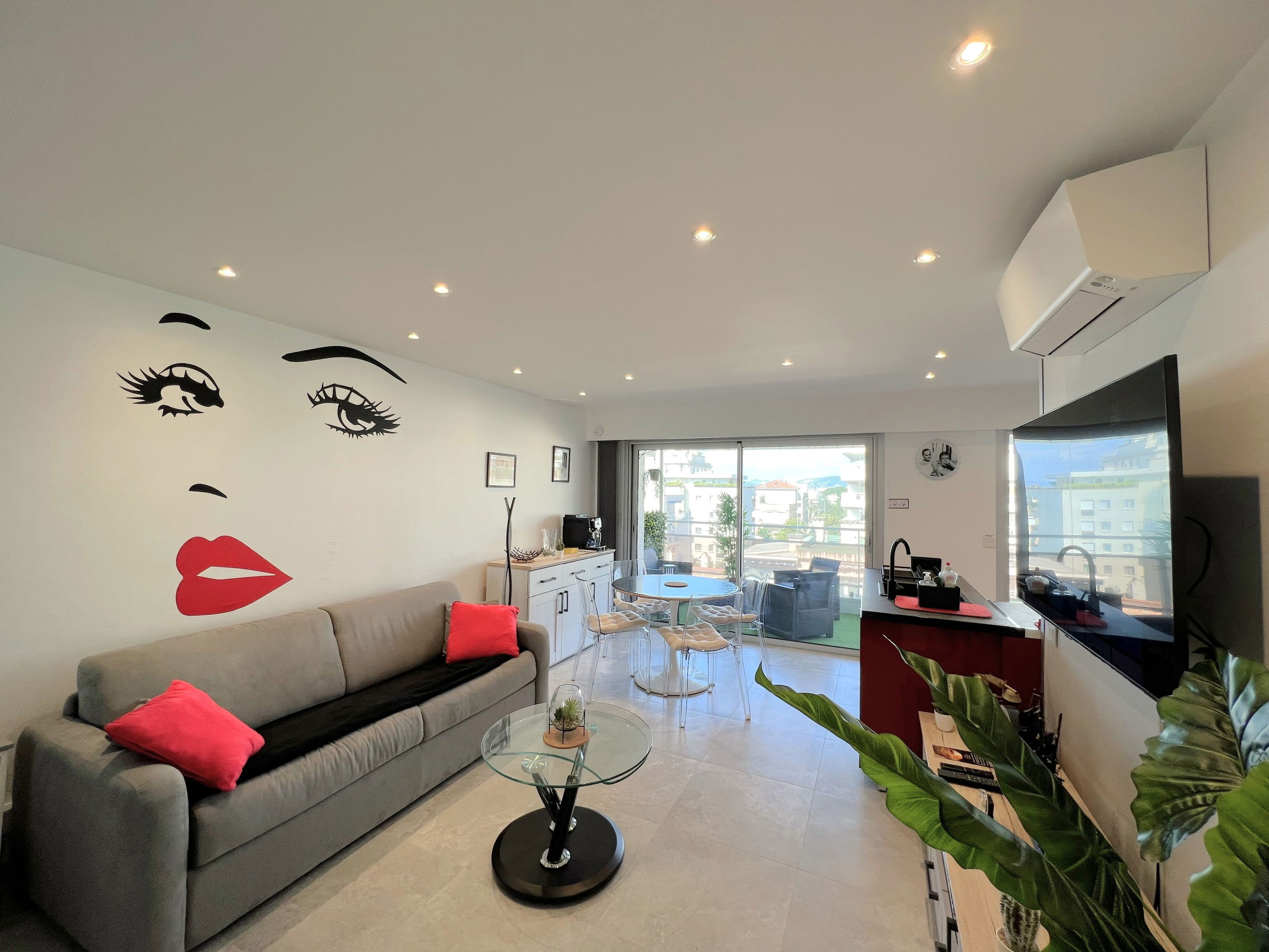 Dans un quartier résidentiel situé à 10 minutes à pied de la Croisette et des plages 2 pièces de 53 m2 en étage élevé qui dispose de 2 terrasses, une chambre, 2 salles d'eau , un beau séjour avec canapé convertible et sa cuisine équipée ouverte, un coin repas.