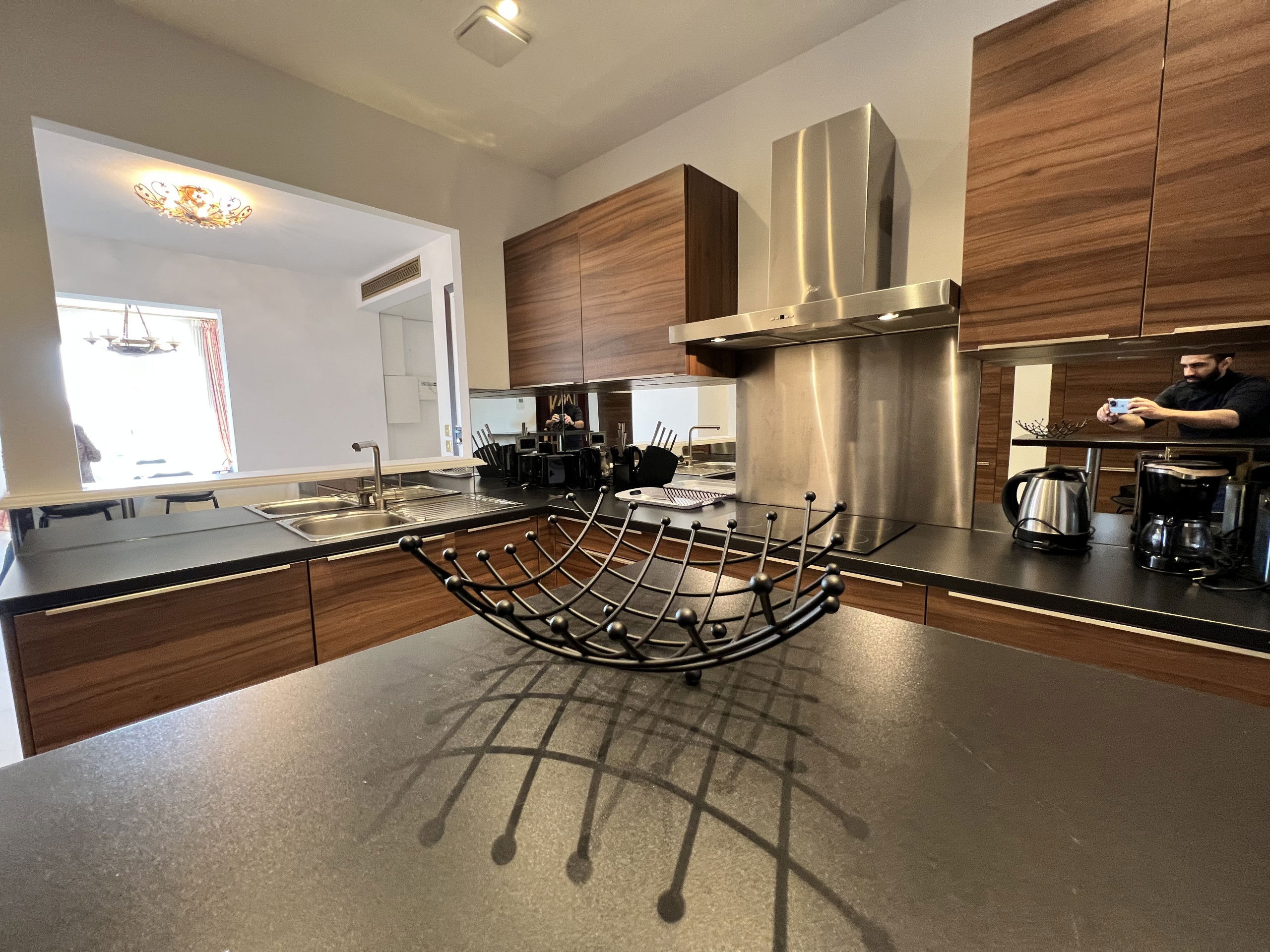 Une grande cuisine entièrement équipée : réfrigérateur américain, four traditionnel et four micro-onde, lave vaisselle, plaque électrique , bouilloire, grille pain, cafetière traditionnelle et Nespresso