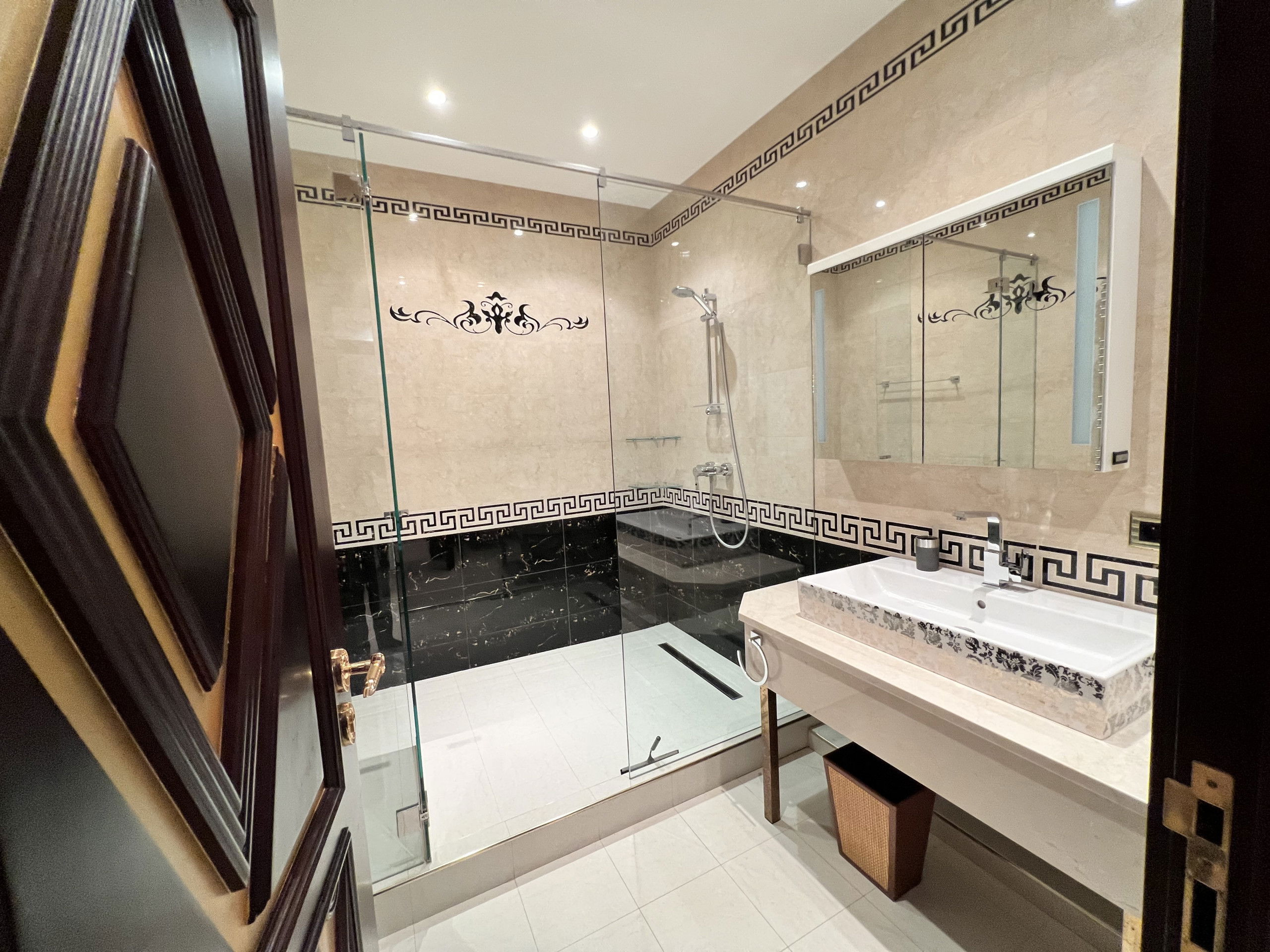 Une chambre avec lit 180x190, coiffeuse, grands placards, balcon vue mer, salle de bain avec immense douche, wc et bidet