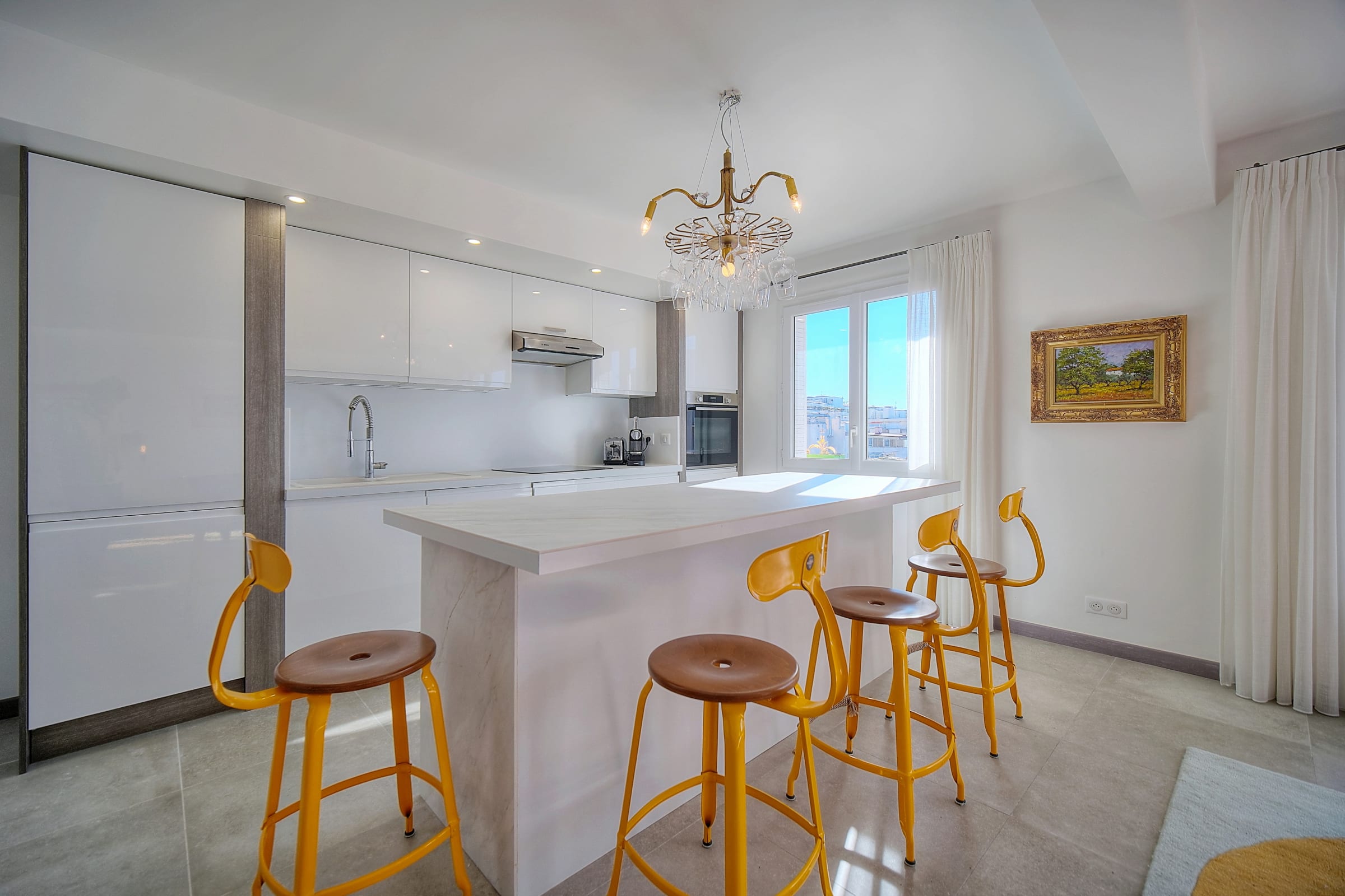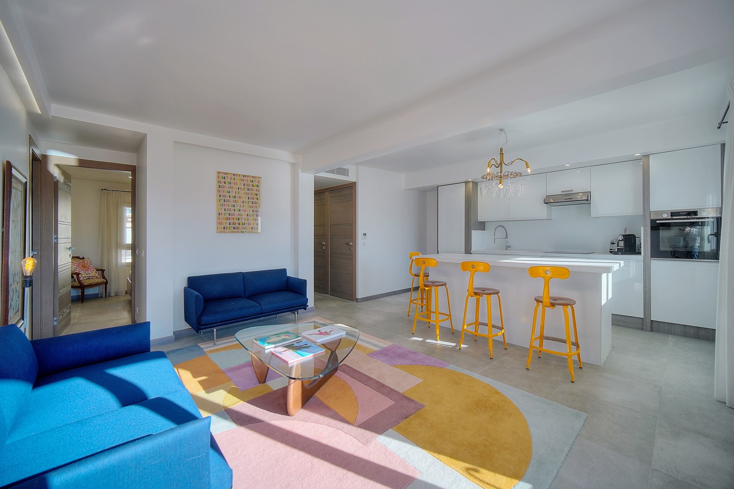 Cet appartement d'environ 55 M² est composé d'une entrée, séjour avec cuisine américaine entièrement équipée, donnant sur la terrasse sud.