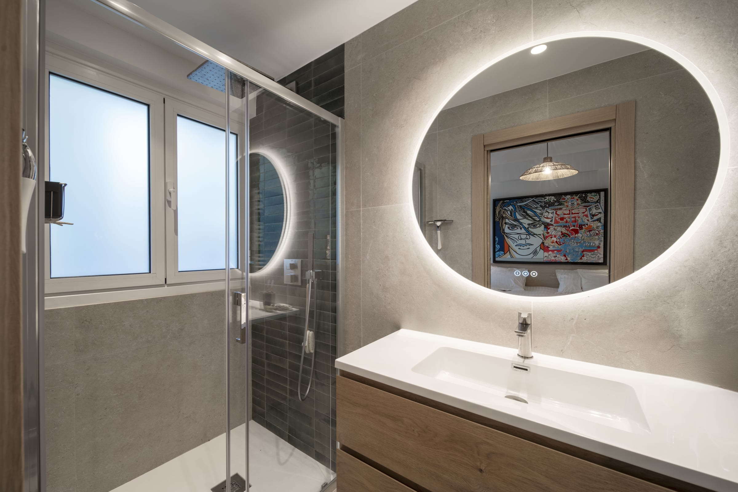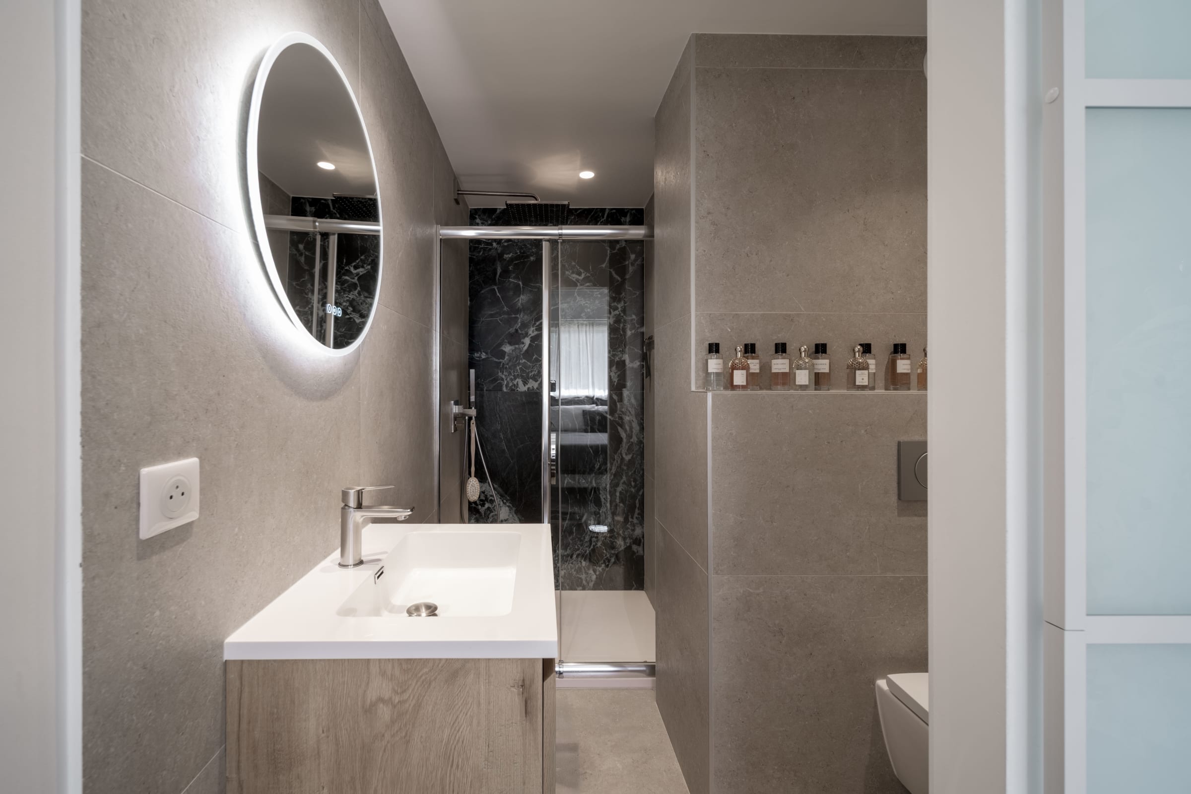 La salle d'eau attenante dispose d'une douche et d'un lavabo.