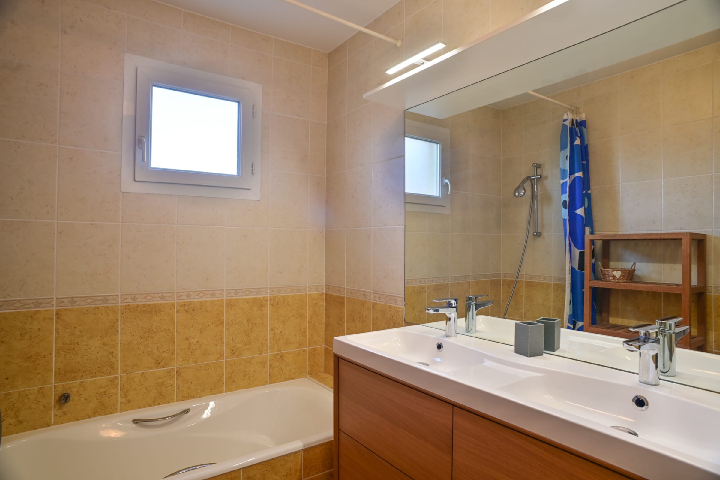 • SALLE DE BAIN : Composée d'une baignoire, d'un meuble double vasque et miroir.