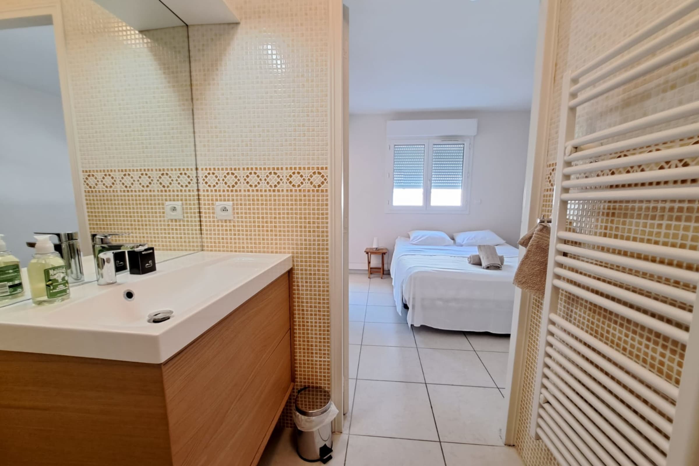 • CHAMBRE 1 : Composée d'un lit Queen Size (160x200), ainsi que d'une salle d'eau comprenant une douche, WC et sèche-serviette. Accès à la terrasse Ouest.
