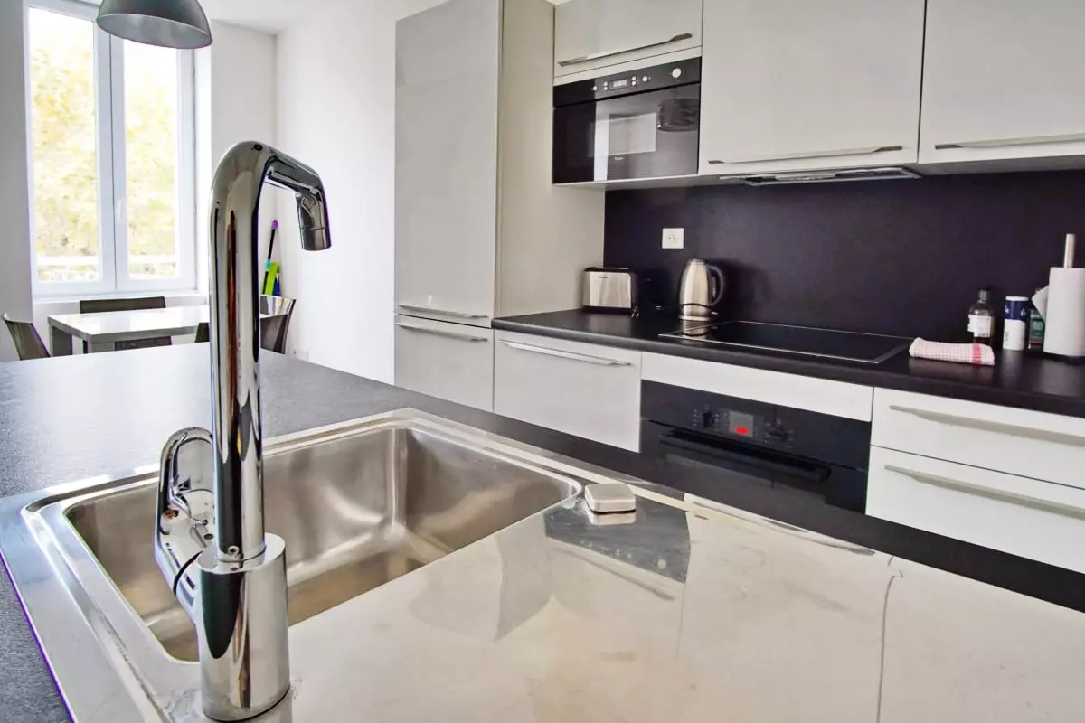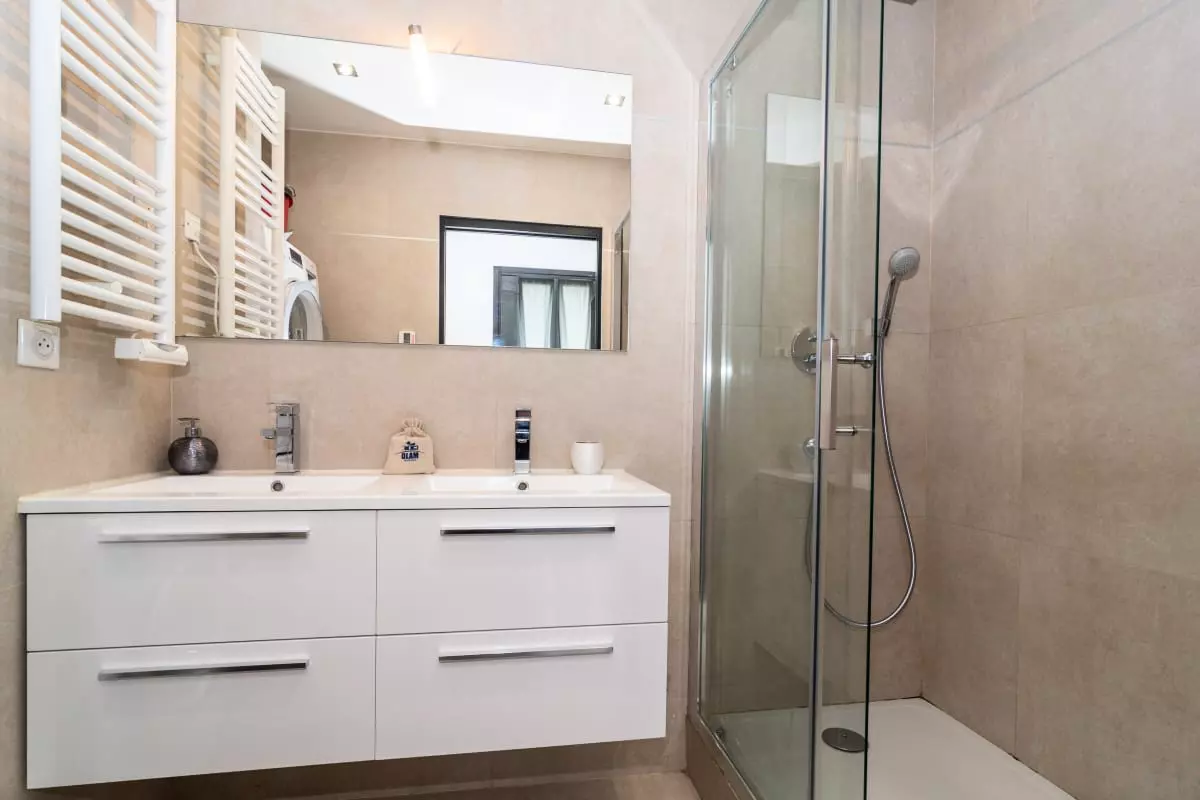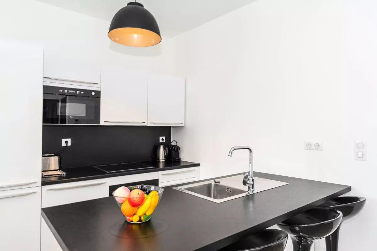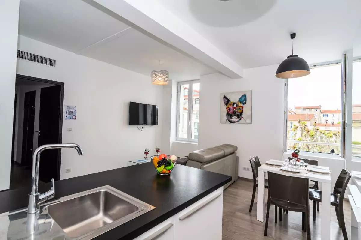 Il dispose d'une cuisine américaine entièrement équipée (frigidaire et congélateur, micro ondes, machine espresso, bouilloire, lave linge et sèche linge, lave vaisselle) qui ouvre sur une pièce à vivre vaste et lumineuse, et qui dispose d'un canapé convertible haut de gamme pour un excellent sommeil.