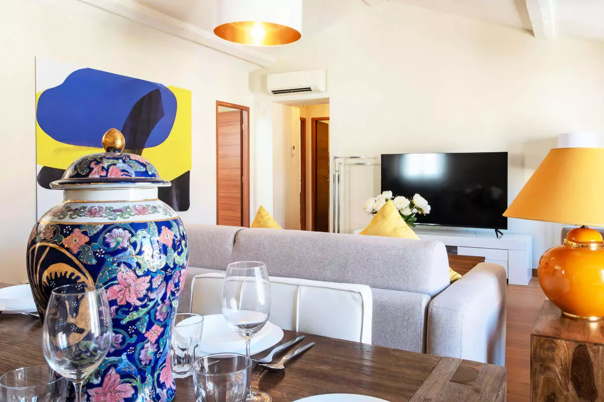 - Une grande pièce à vivre avec un salon décoré soigneusement : 2 grands canapés, smart TV grand écran, ainsi qu’un espace repas pour 6 personnes.