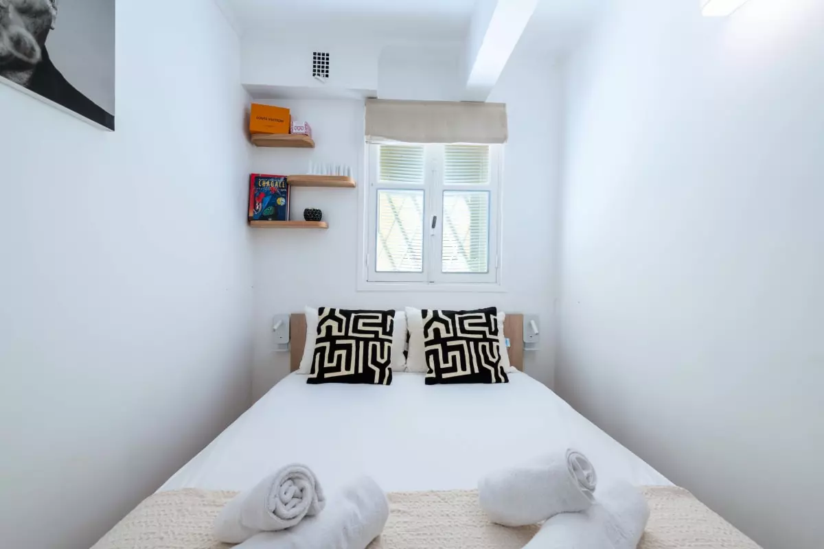 - Une chambre avec un lit double (140x190cm), rangements et fenêtre sur le jardin