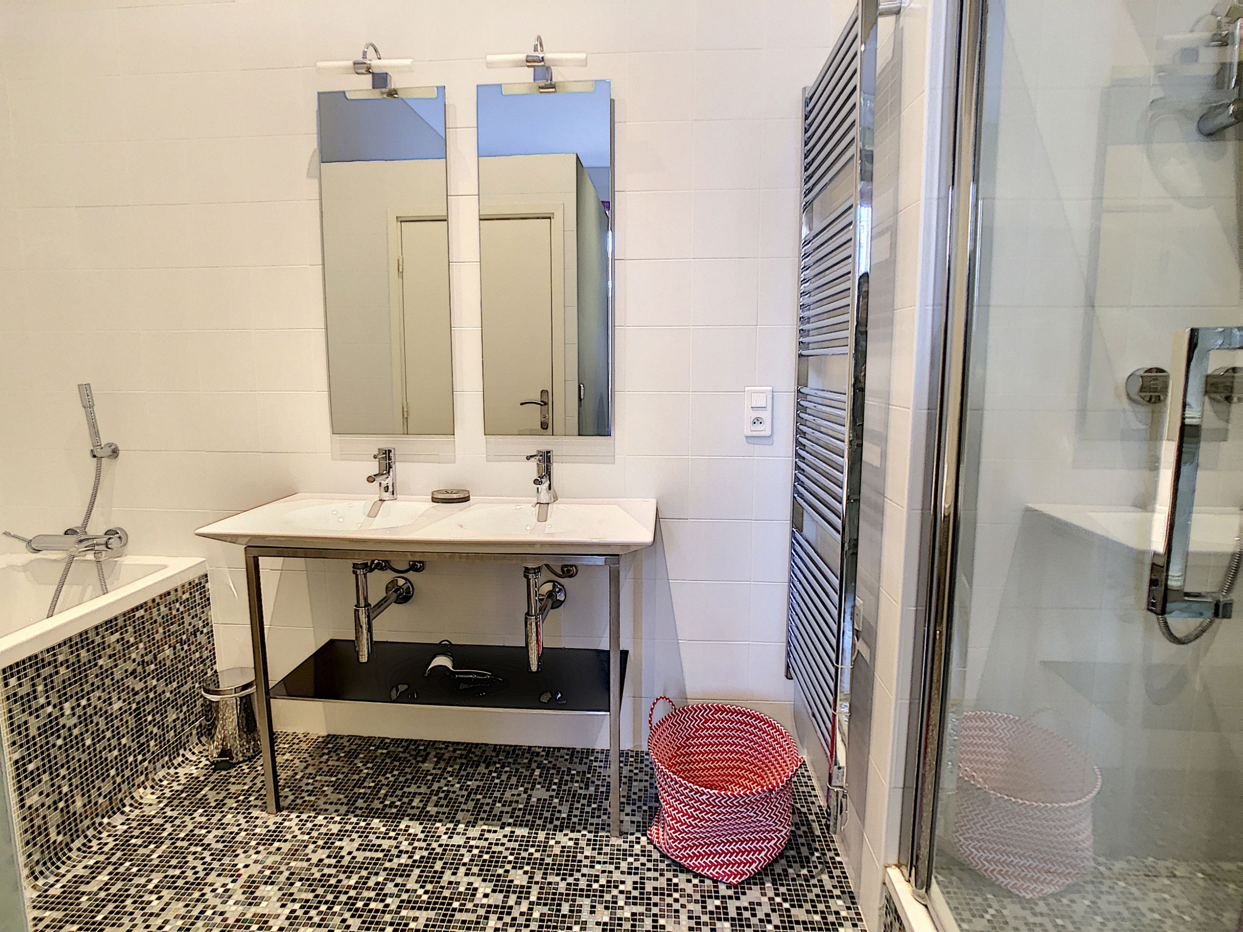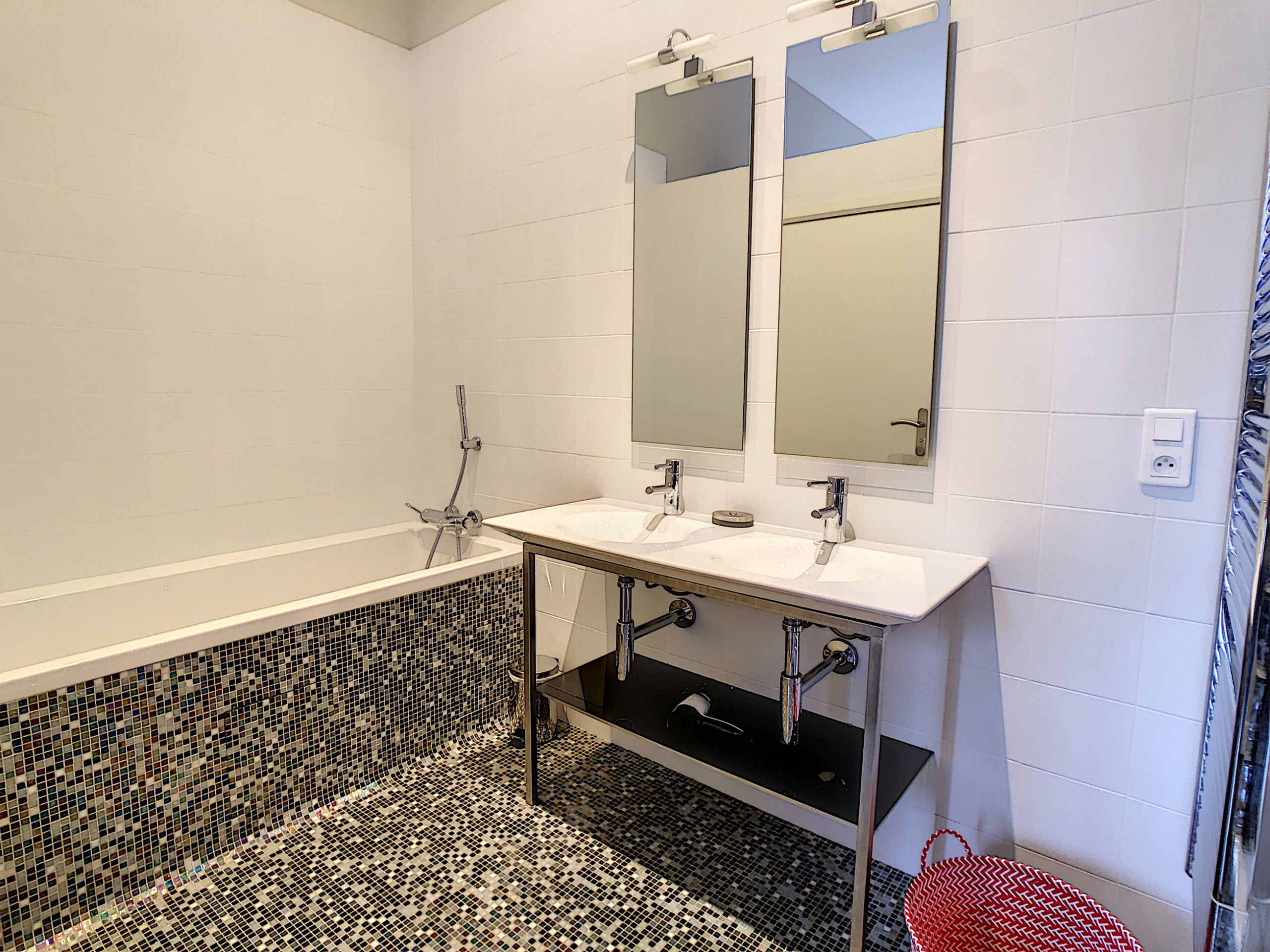 1 chambre avec un lit 2 personnes (160x190), armoire, salle de bain attenante avec baignoire, douche, vasque, wc