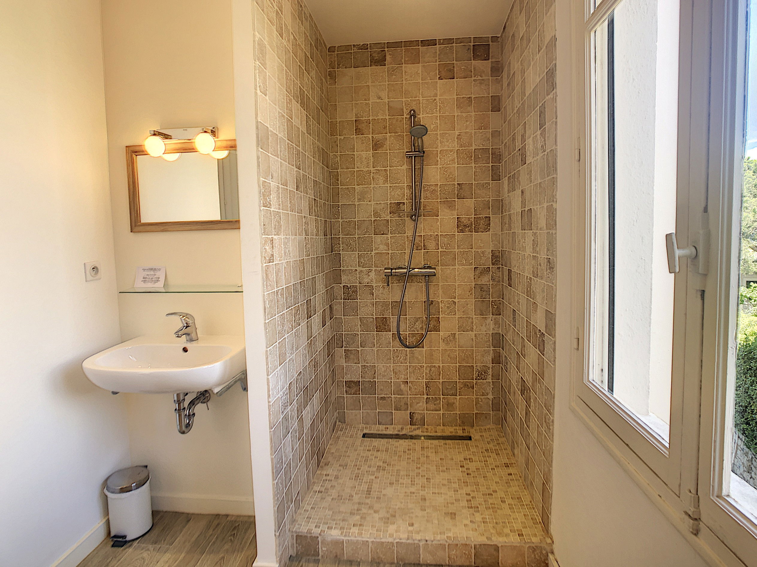 Une chambre avec un lit double (140x190) et sa salle de douche attenante.