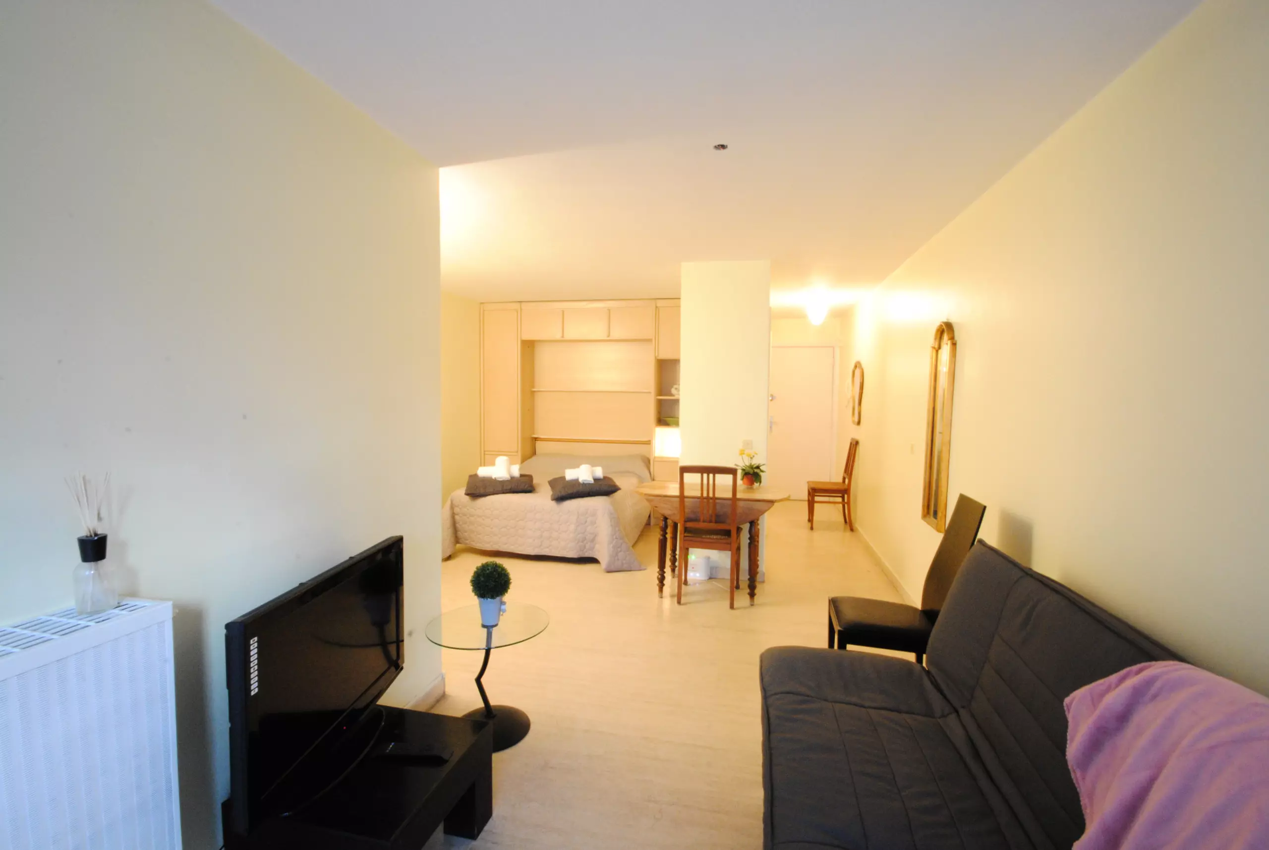 Séjour avec coin nuit : lit 2 personnes 140x190 et un canapé lit 130x190
