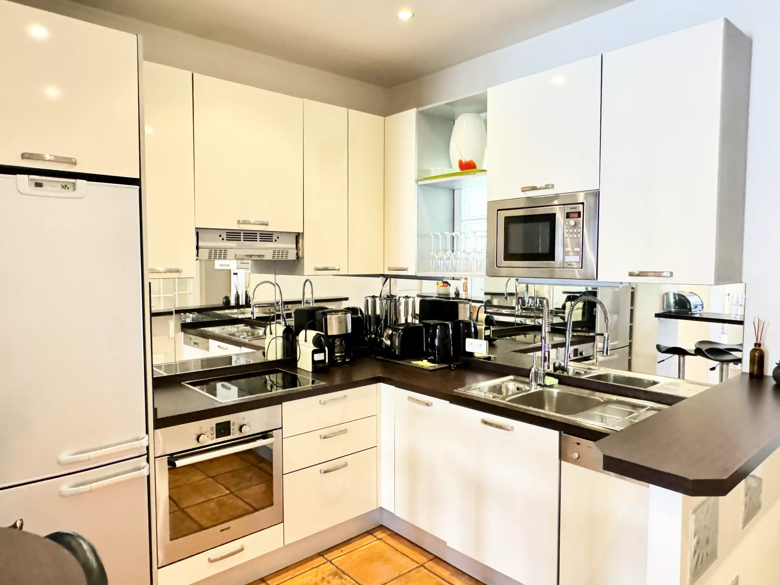 L'espace cuisine avec une partie mange debout : lave vaisselle, plaque vitro, four, micro onde, réfrigérateur, congélateur, Cafetière Nespresso, bouilloire, grille pain, une grande table dépliable pour 8 personnes,