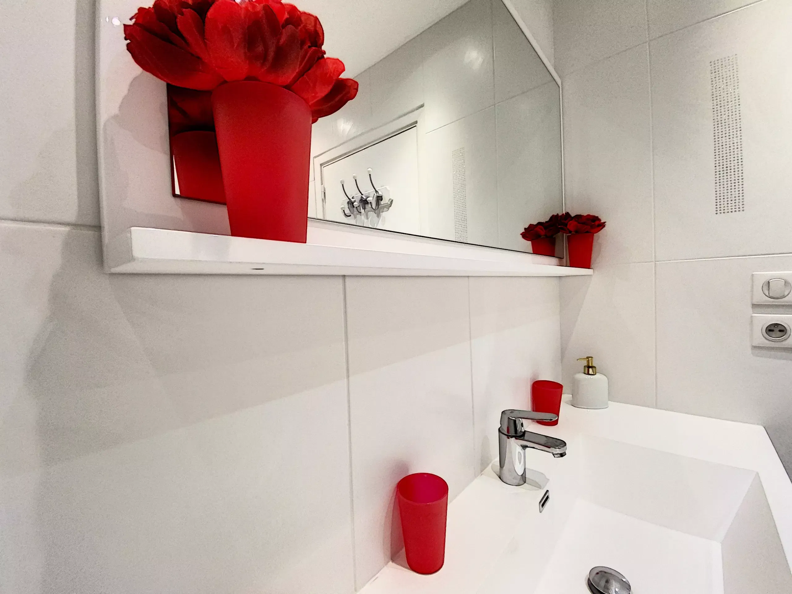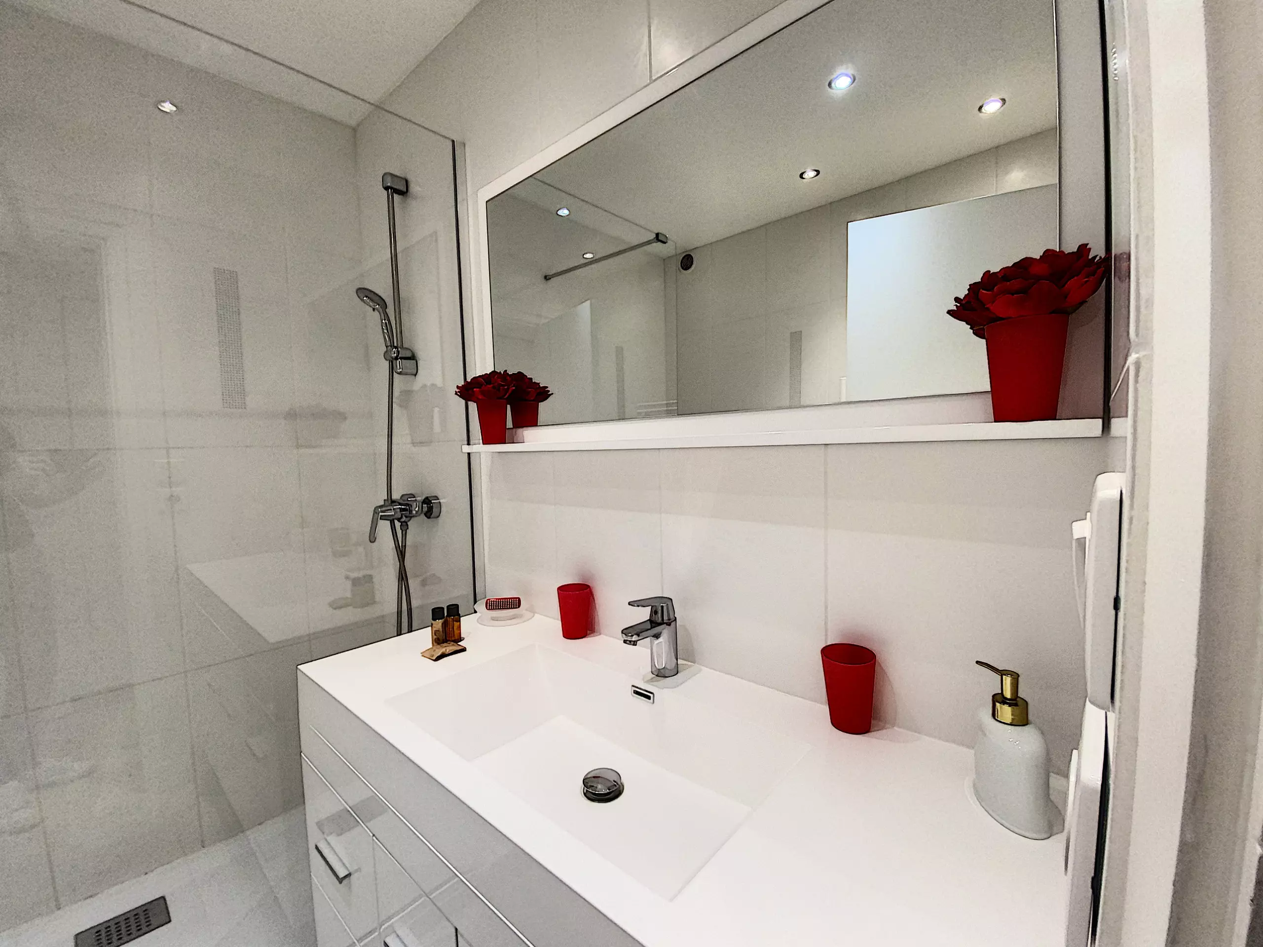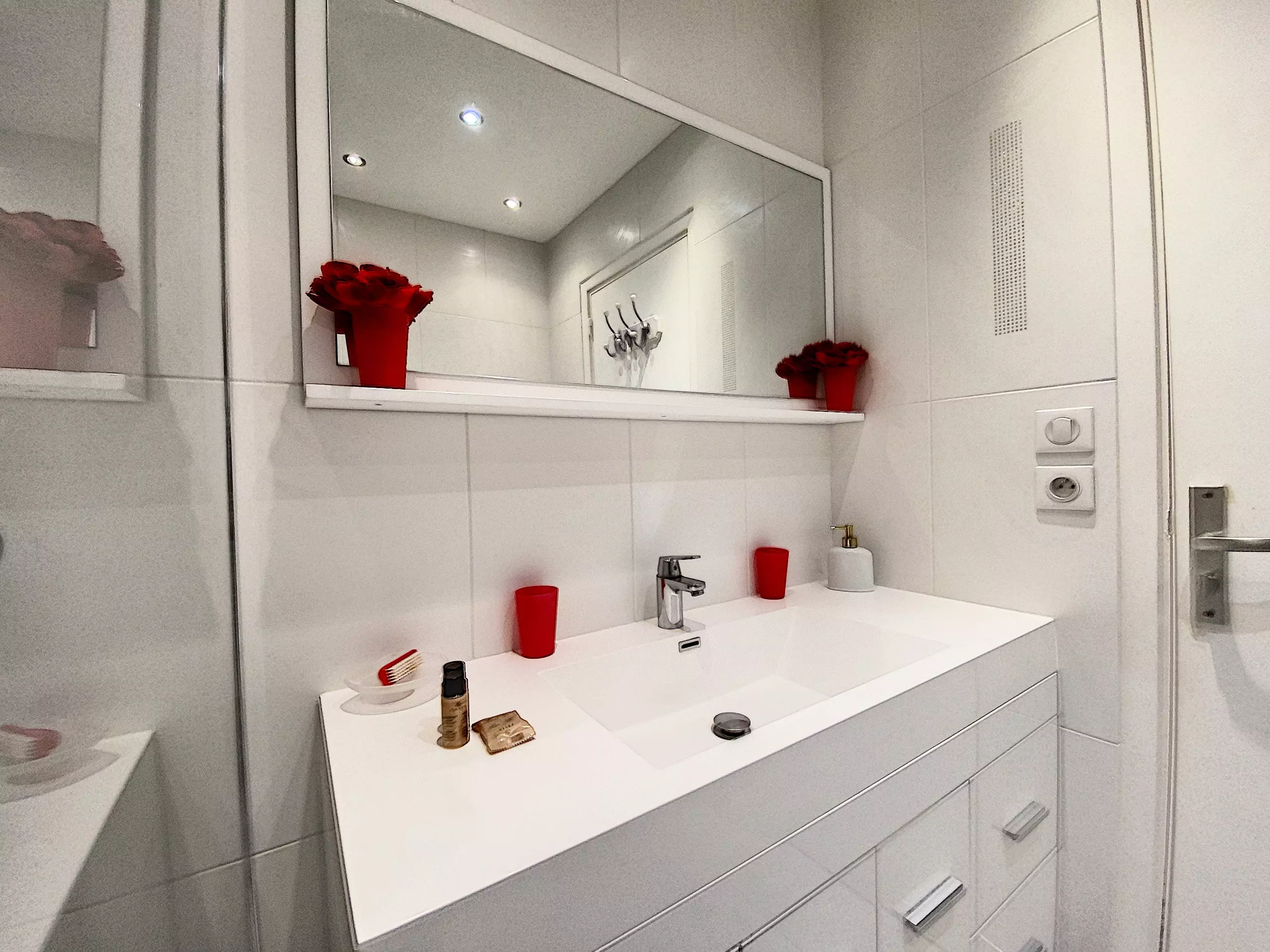 La salle de bains, avec douche, lave-linge et sèche-cheveux, offre une commodité supplémentaire. Les toilettes sont séparées pour plus d'intimité. Un fer et table à repasser sont à disposition.