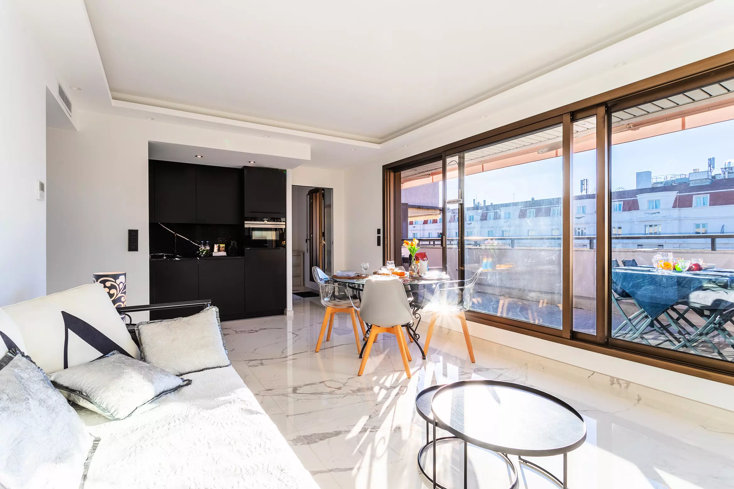 Les deux pièces s'ouvrent sur la terrasse, meublée de sièges extérieurs, créant une atmosphère sereine et relaxante.