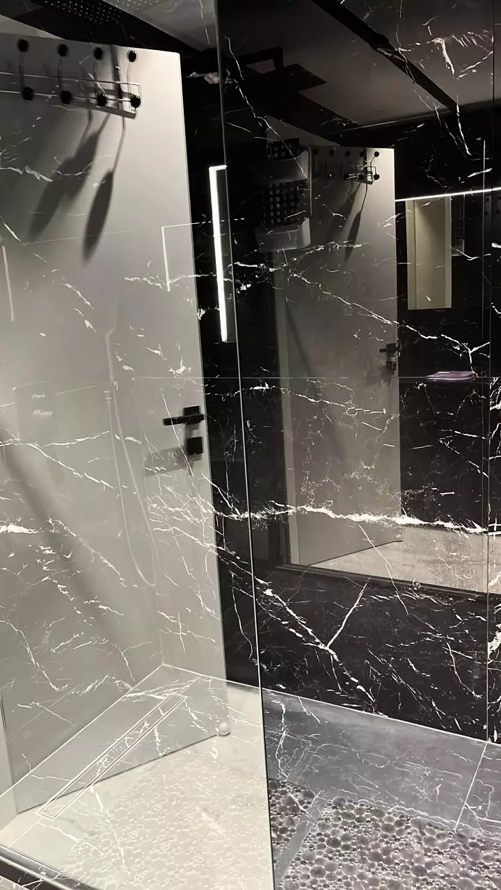 La chambre offre un lit double . Salle de douche en marbre