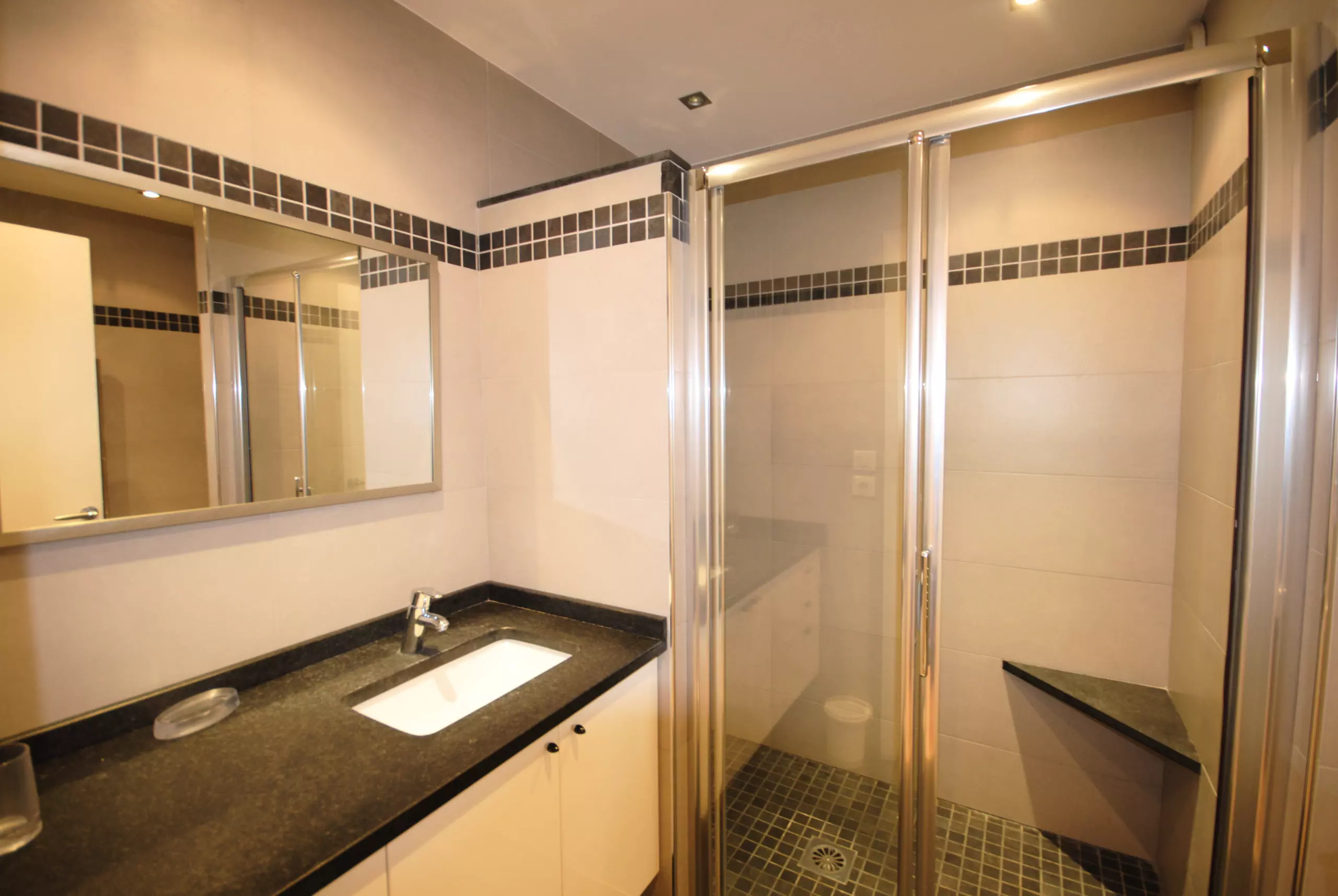 La salle de bains est équipée d'une douche, et d'un sèche-cheveux, et les toilettes sont séparées pour plus de commodité. L'appartement bénéficie de la climatisation fournie par l'immeuble, assurant un confort optimal. Une terrasse avec mobilier d'extérieur offre un espace extérieur agréable pour profiter du climat méditerranéen. Un fer et table à repasser sont à disposition.