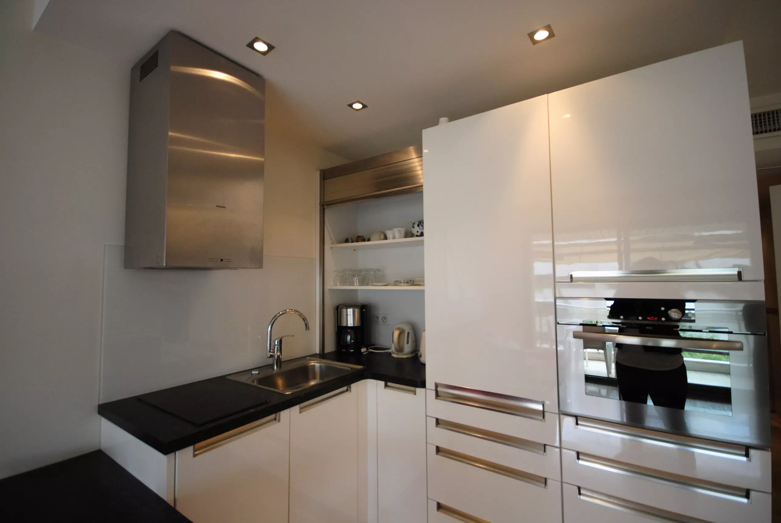 La cuisine, ouverte sur le séjour est très bien équipée : un réfrigérateur, un micro-ondes combiné, une plaque électrique 2 feux, une bouilloire, une cafetière Nespresso et un grille-pain, offrant tout le nécessaire pour préparer vos repas.