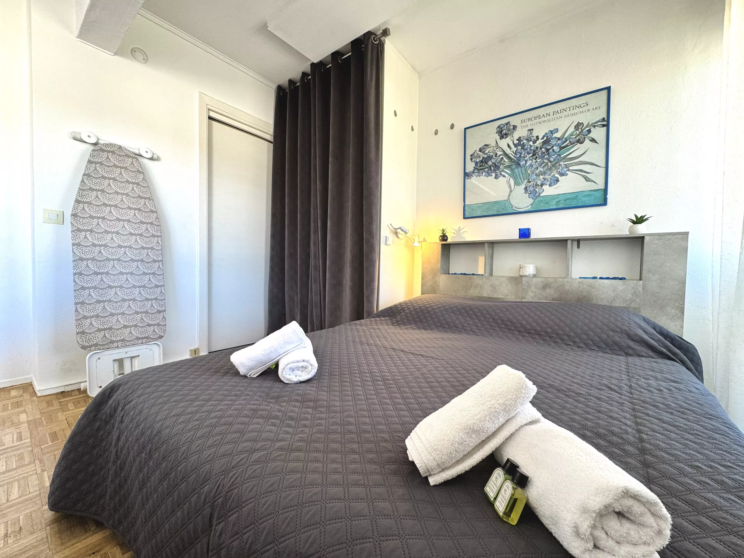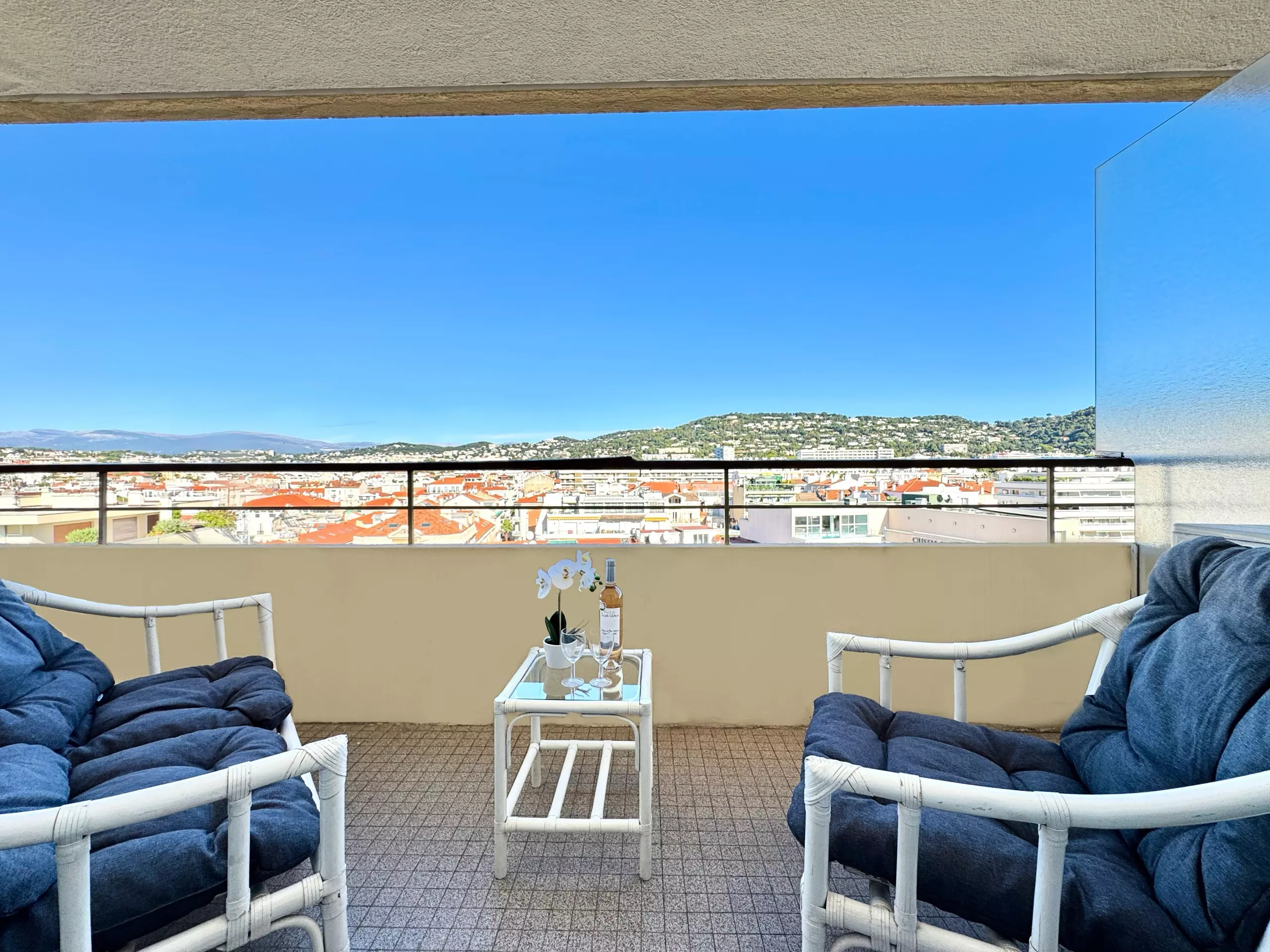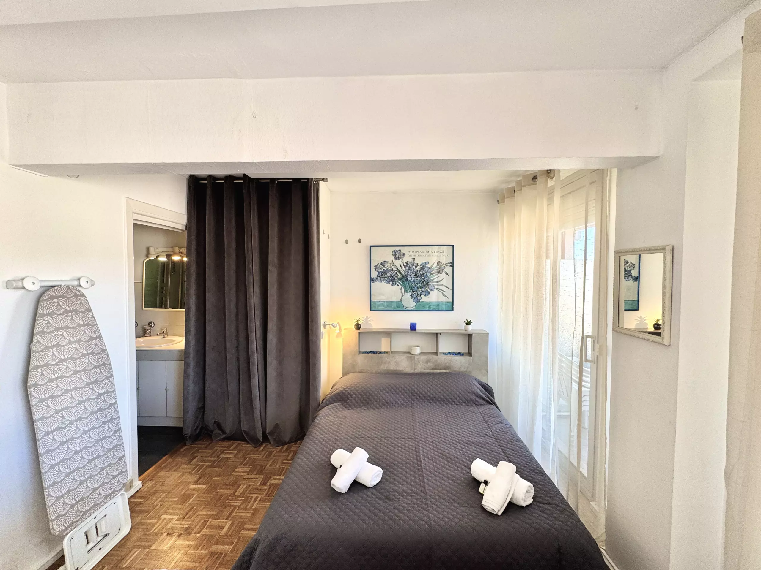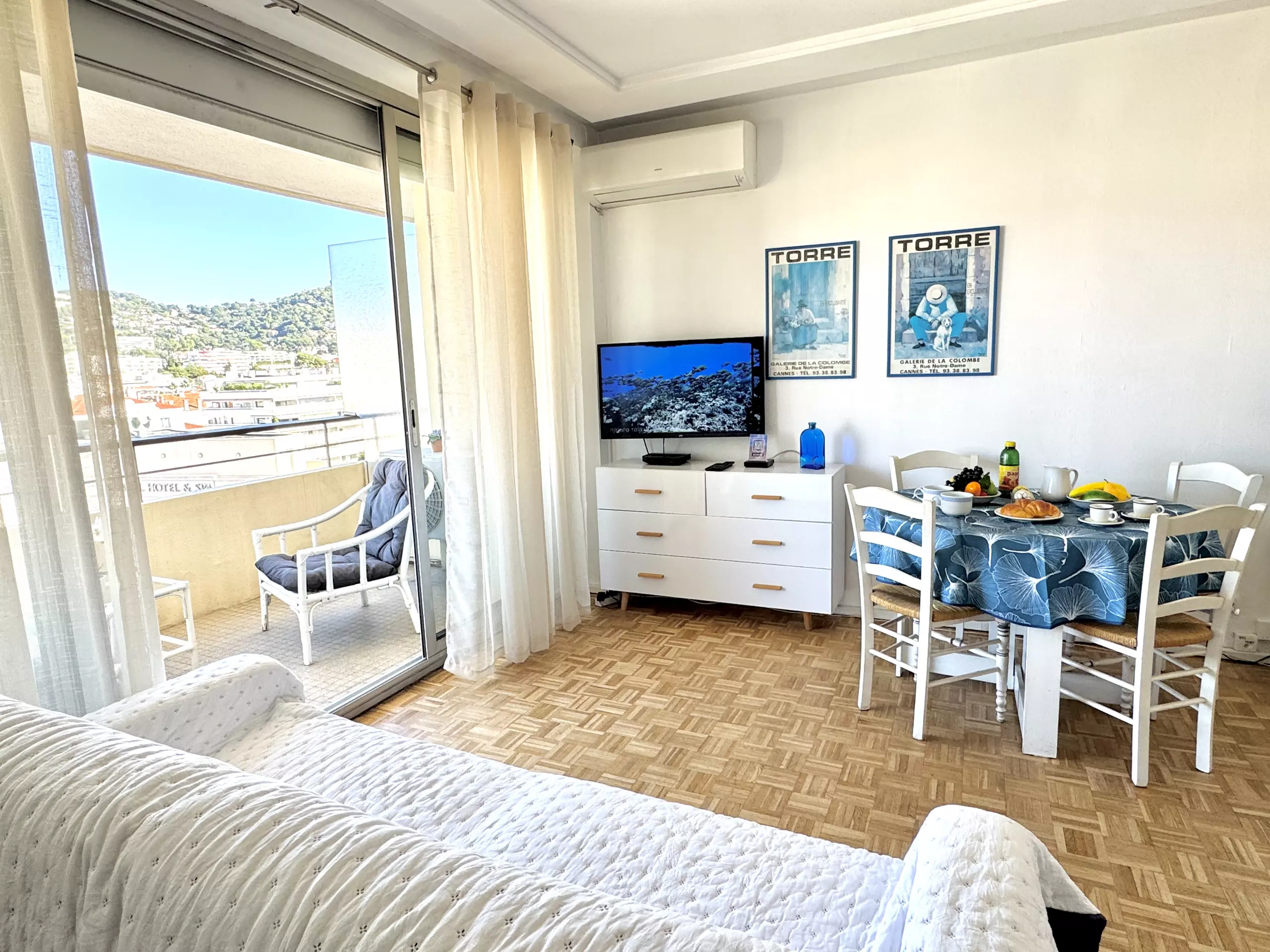 Le séjour se compose d'un lit double 160X200, d' un canapé convertible pour 2 personnes. Le tout ouvrant sur une belle grande terrasse avec vue sur les collines de Cannes.