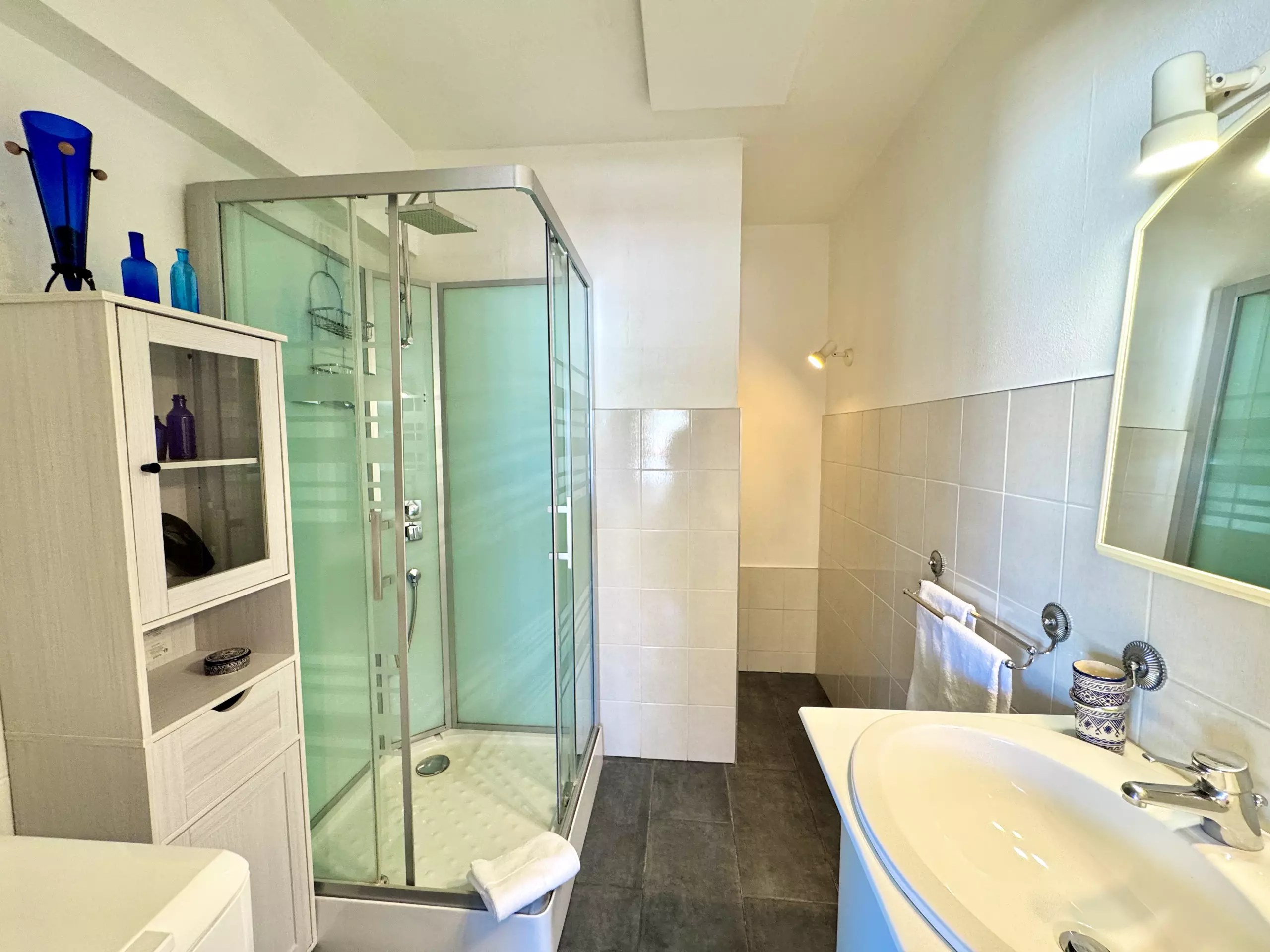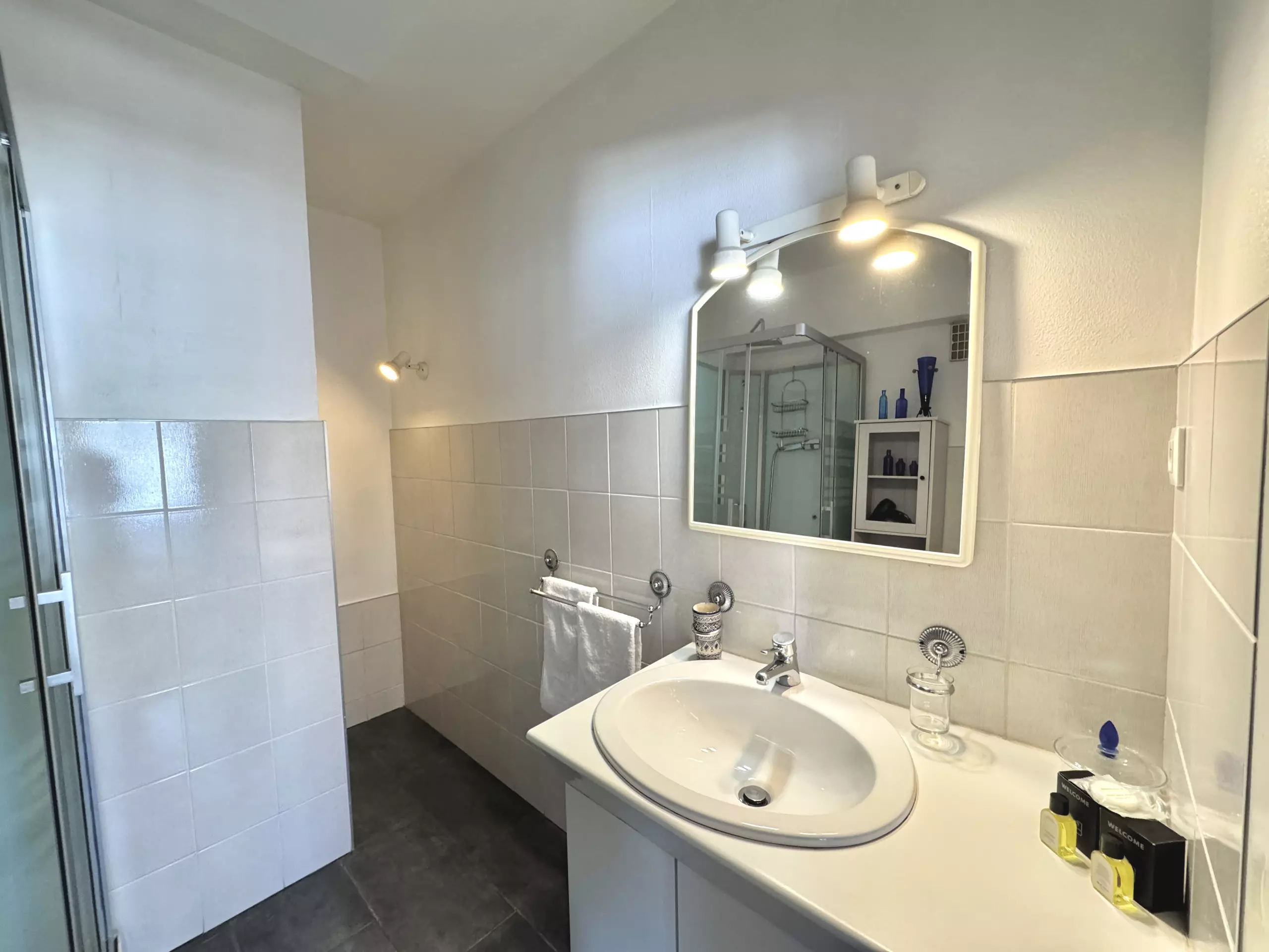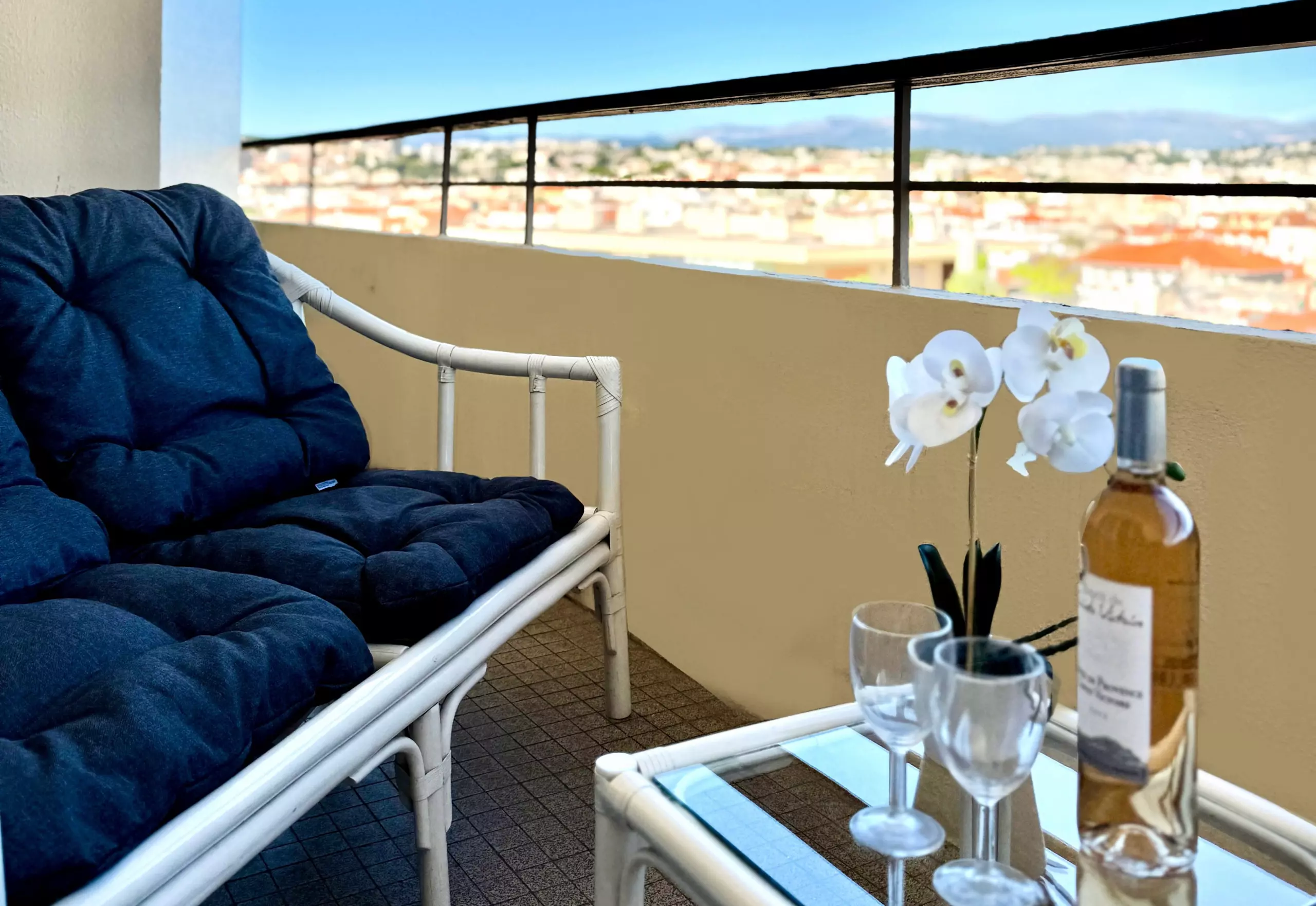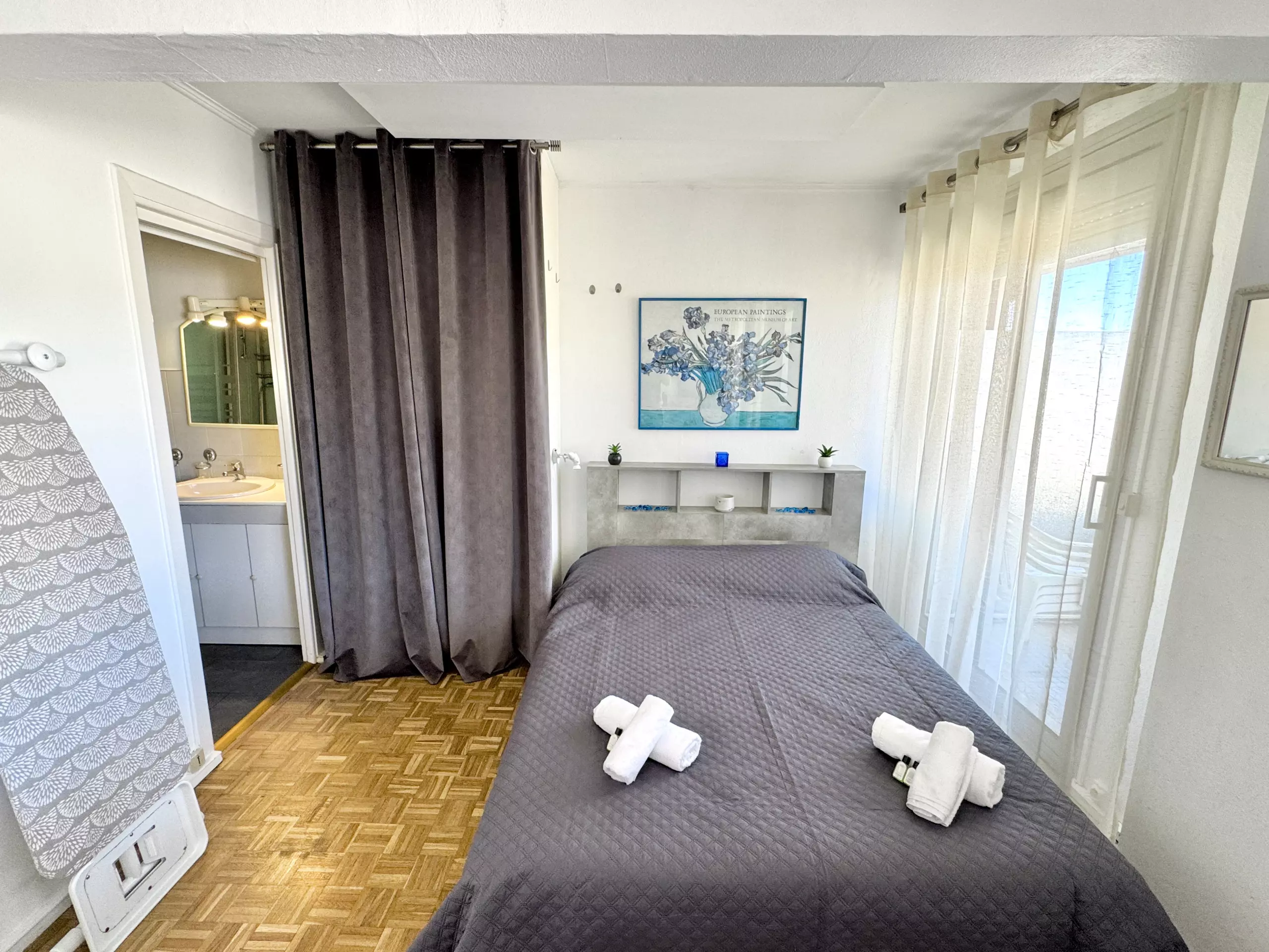 Le séjour se compose d'un lit double 160X200, d' un canapé convertible pour 2 personnes. Le tout ouvrant sur une belle grande terrasse avec vue sur les collines de Cannes.
