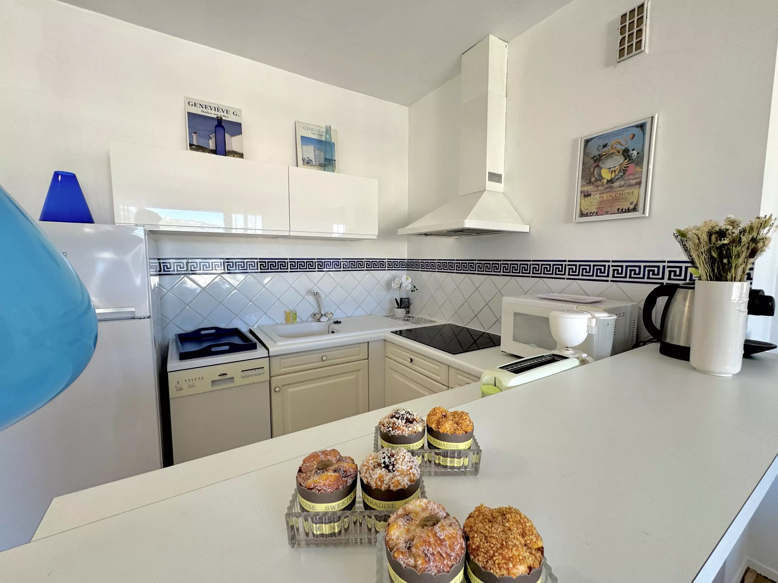 Cuisine ouverte équipée : réfrigérateur , congélateur, micro-onde, plaque de cuisson, grille pain, bouilloire, cafetière filtre et Nespresso