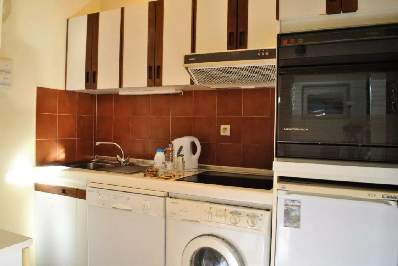 cuisine équipée séparée (plaque de cuisson 3 feux, lave linge, lave vaisselle, réfrigérateur, micro onde, bouilloire