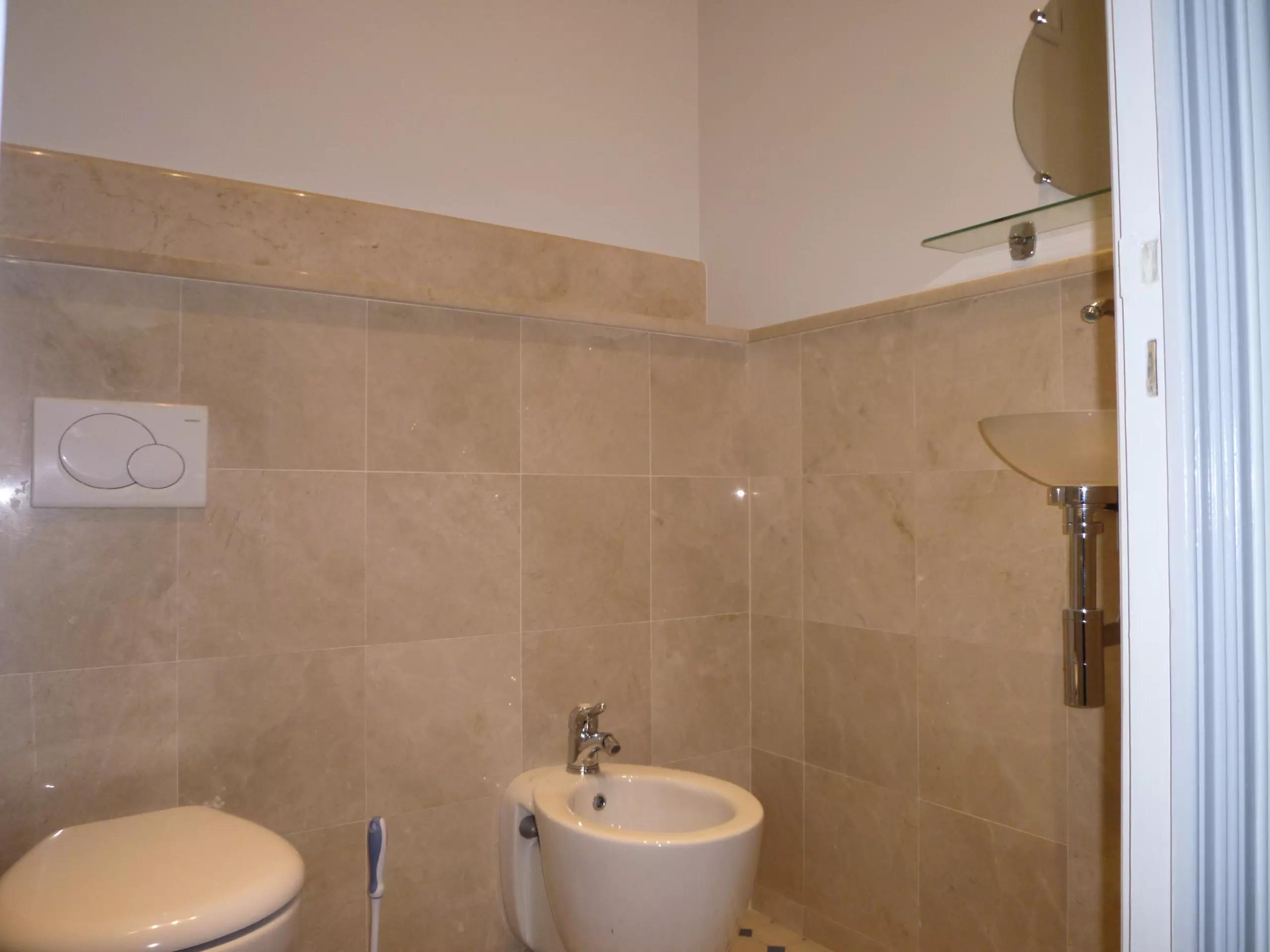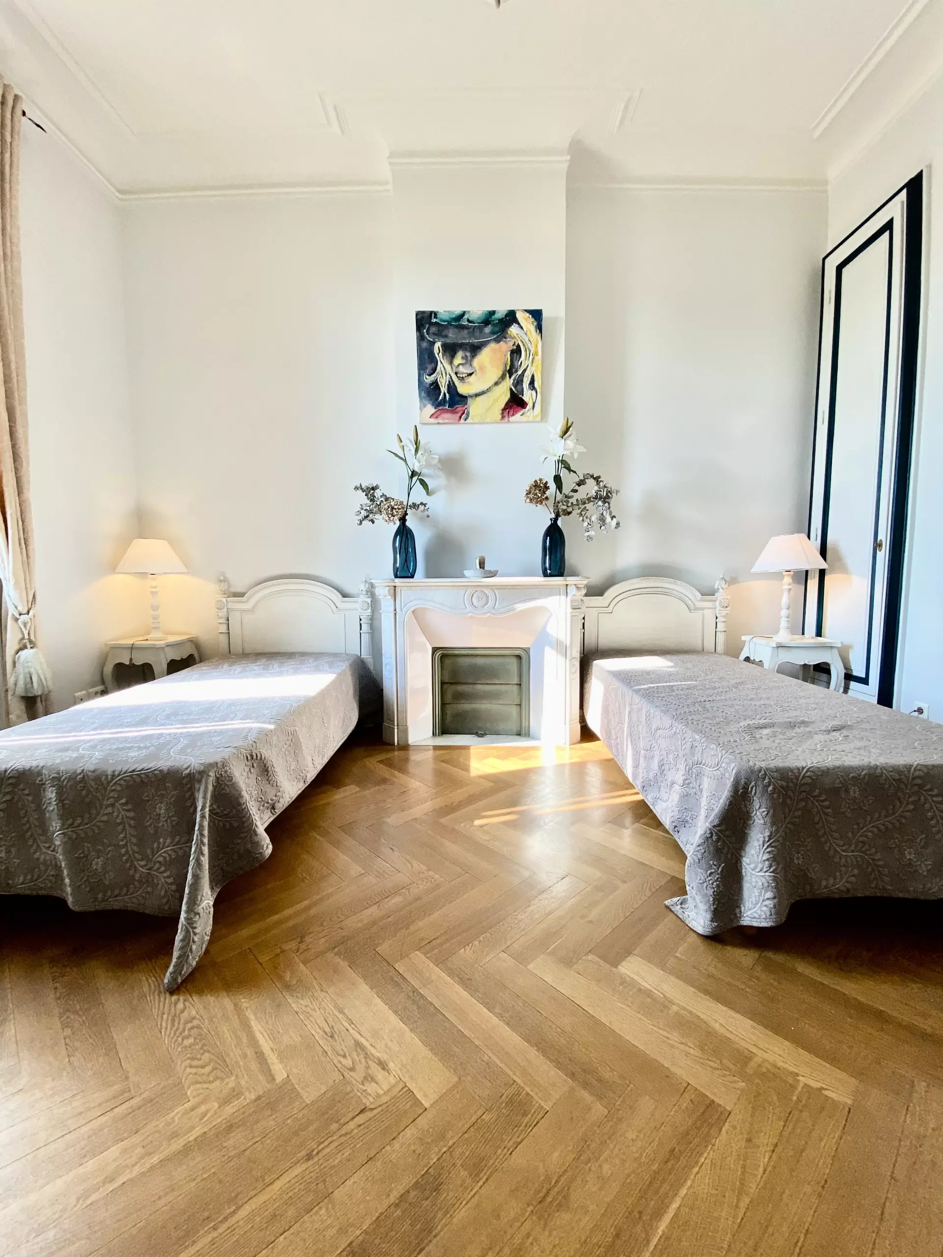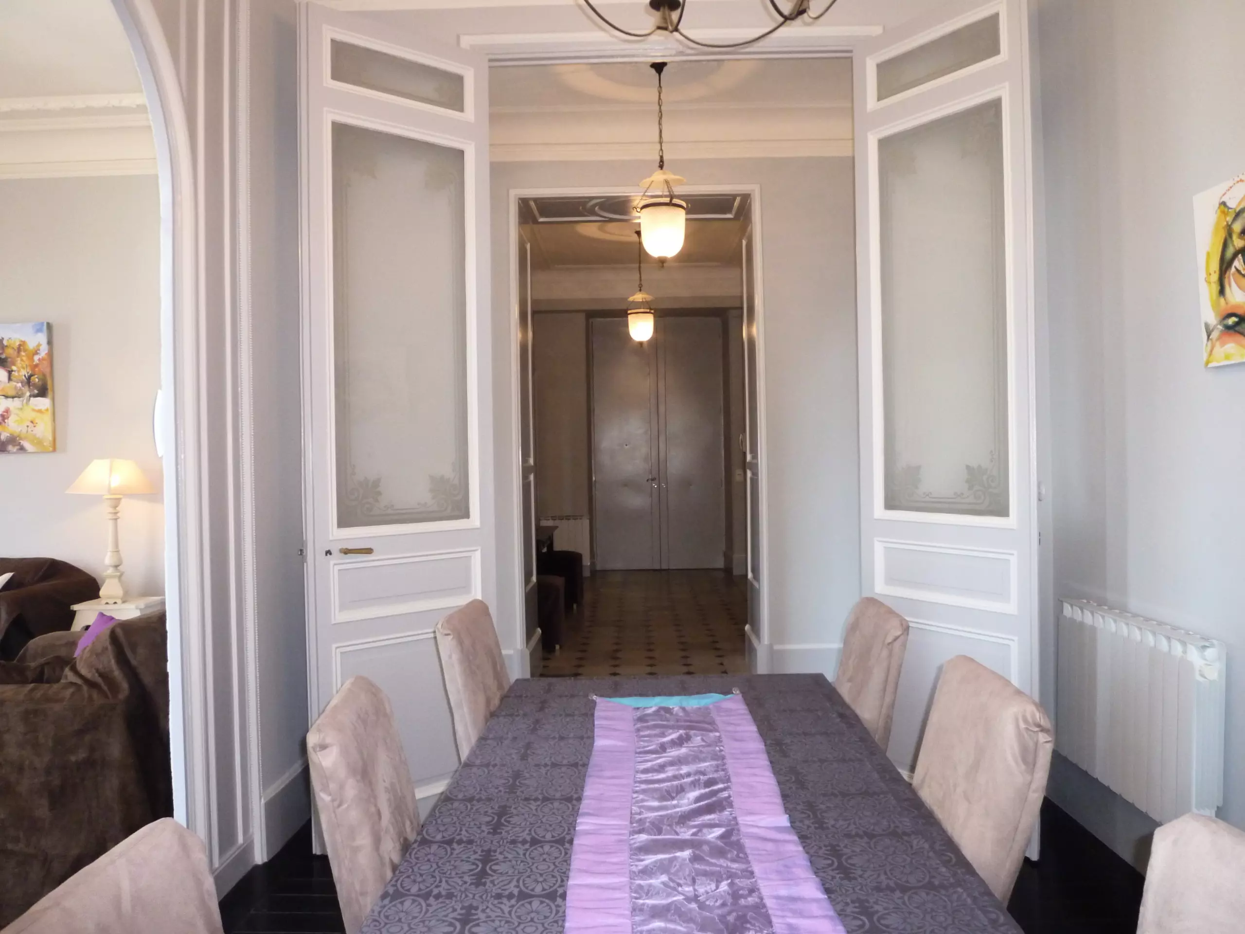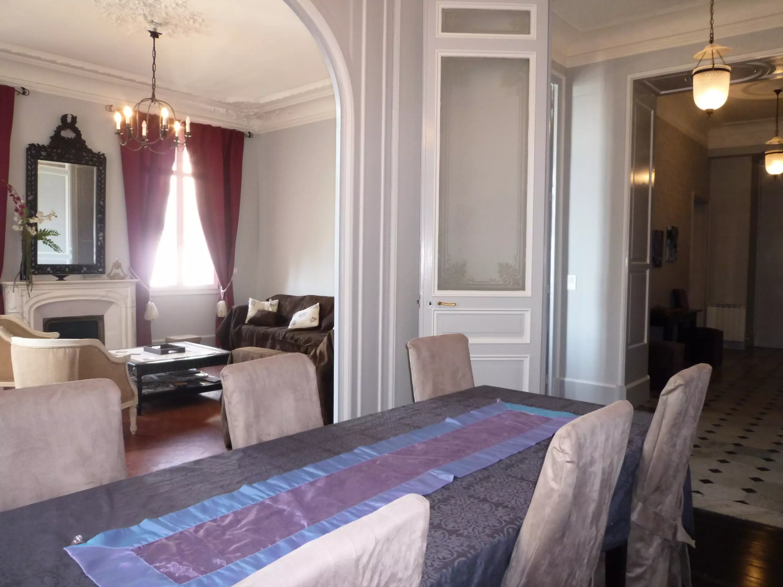 Un long couloir mène à une cuisine entièrement équipée, des toilettes invités et deux premières chambres avec leurs lits jumeaux. La pièce à vivre se compose d'une spacieuse partie salon, très lumineuse avec deux portes-fenêtres (dont une avec un petit balcon et vue sur le vieux port), une télévision satellite, et d'une partie salle à manger ou salle de réunion.