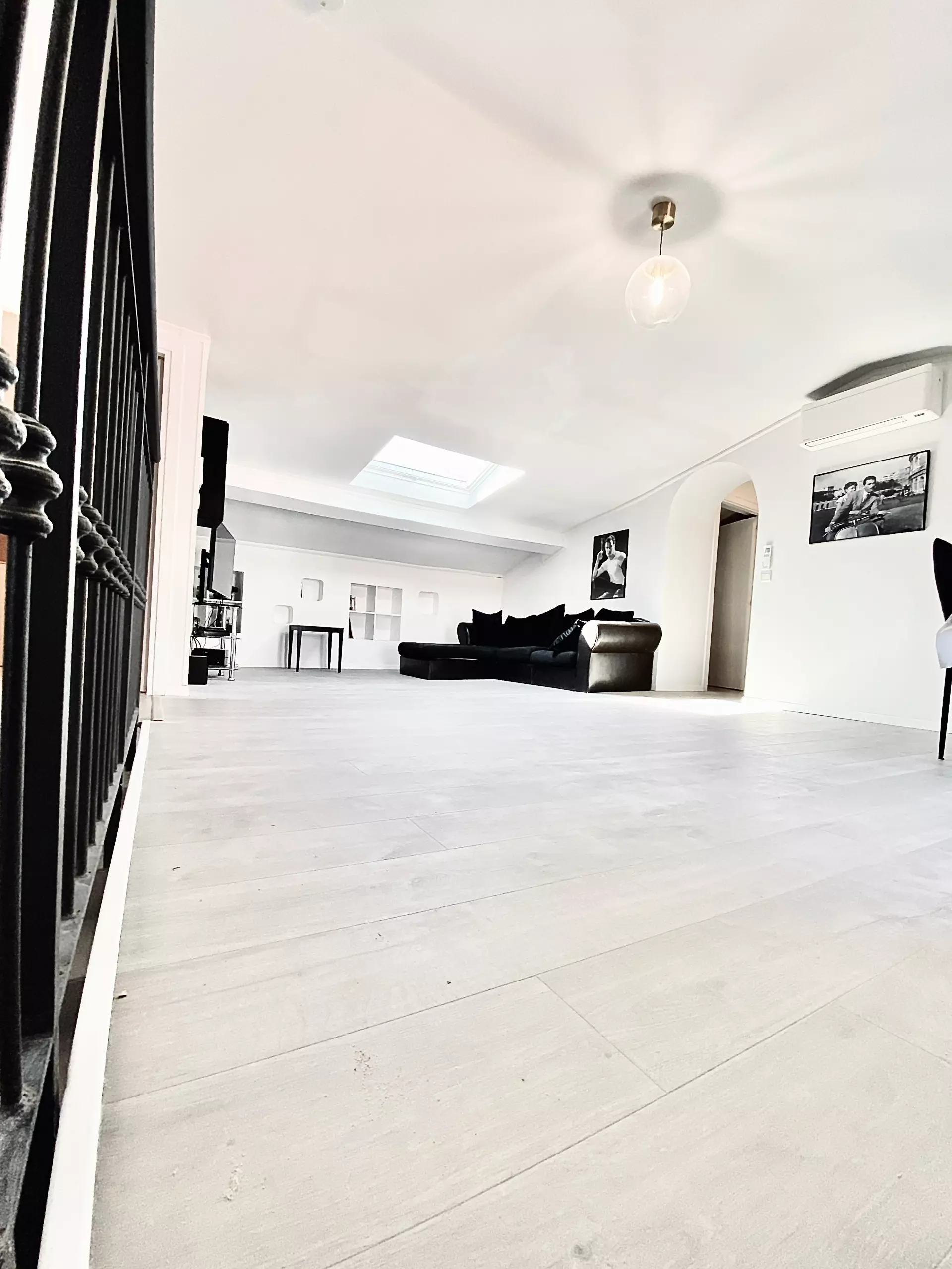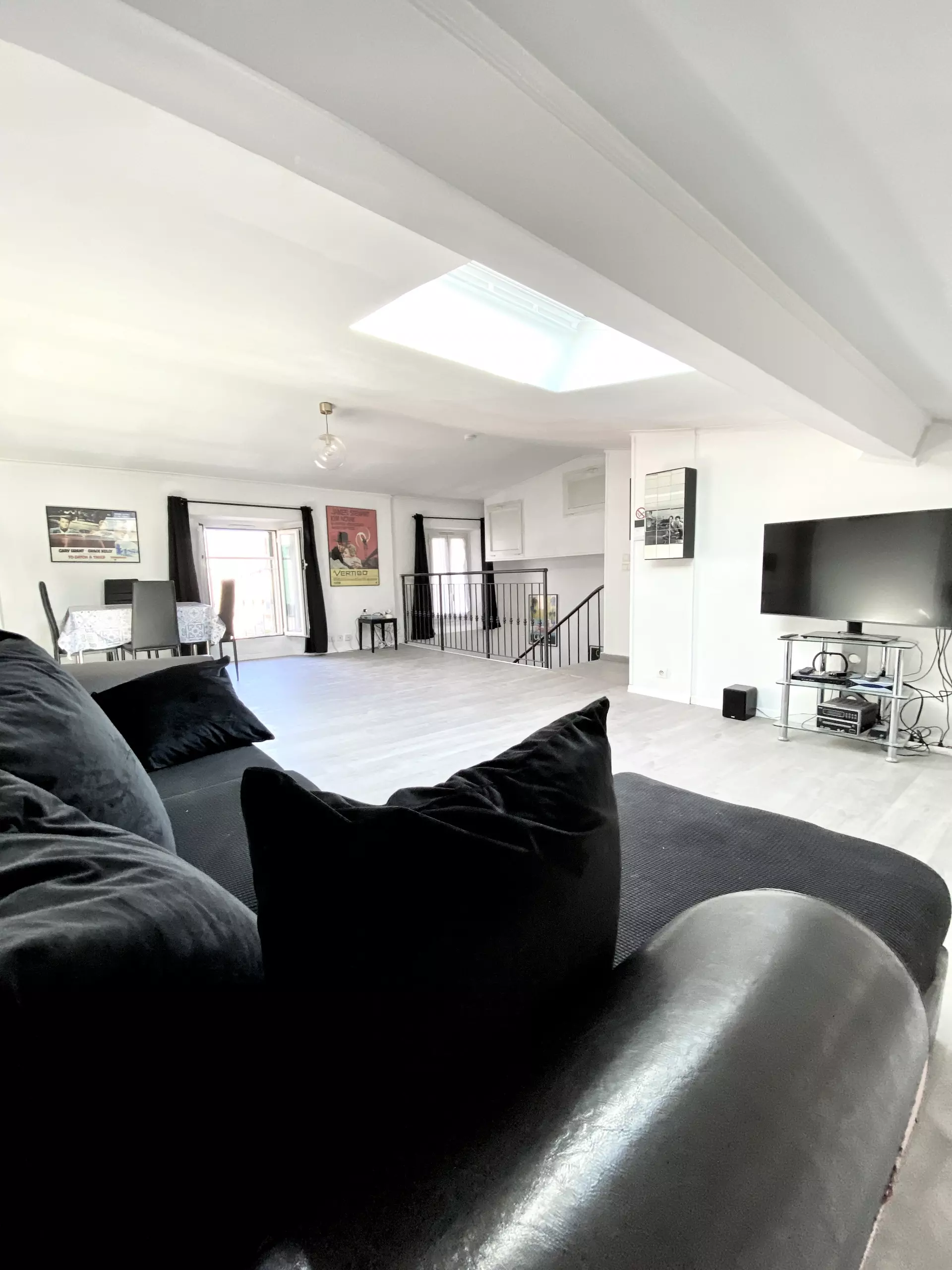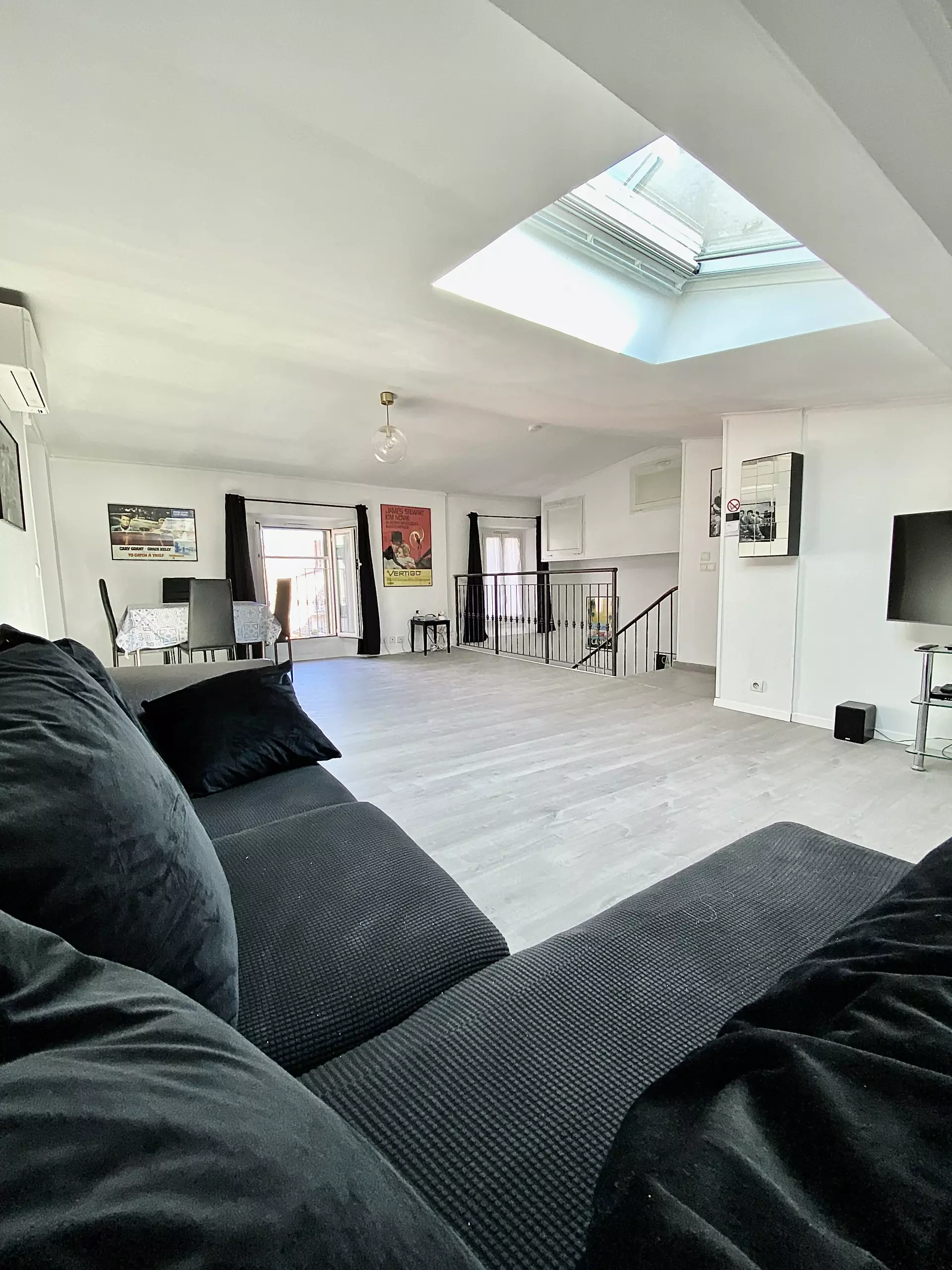 Grand salon environ 30 m2, avec grand velux pour une luminosité optimale et 2 fenêtres sur cour.