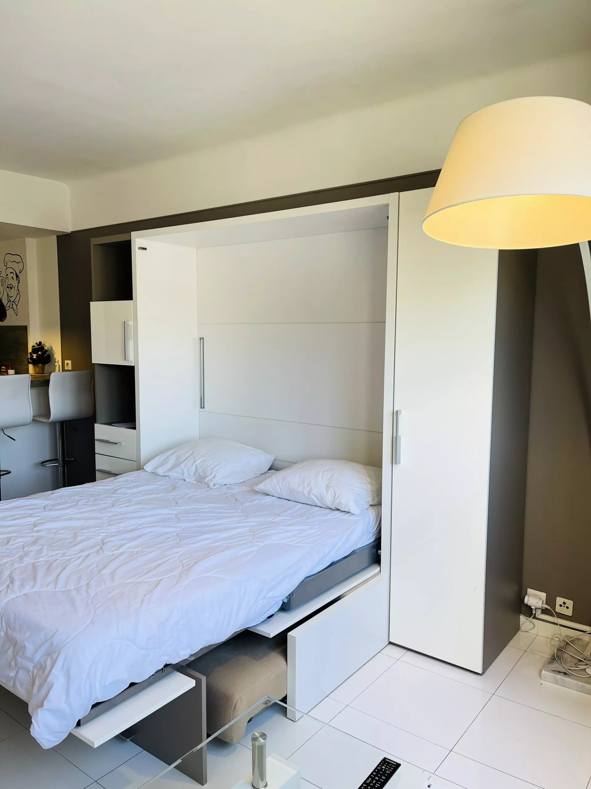 Le cœur de ce studio est aménagé de manière fonctionnelle, offrant un espace de vie polyvalent qui s'adapte à vos besoins. La kitchenette, bien équipée, comprend un réfrigérateur, un four, un micro-ondes, lave-vaisselle, une machine à laver, une cafetière, un grille-pain, un presse-agrume, ainsi que tous les ustensiles nécessaires pour préparer vos repas. Elle est intégrée de manière discrète dans le coin repas, favorisant ainsi une utilisation optimale de l'espace.