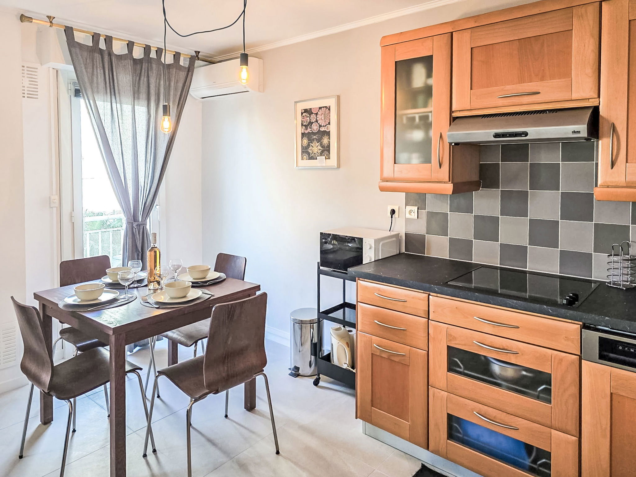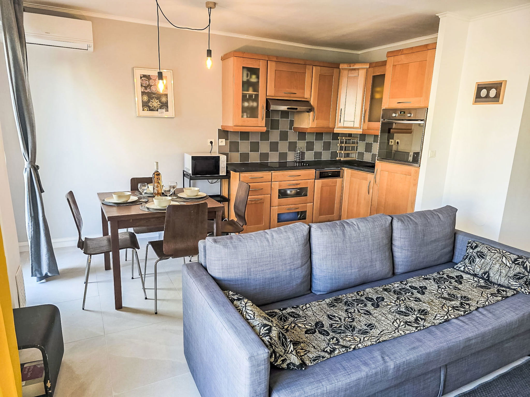 "Résidence Astrid", Appartement de 2 pièces 58 m2 au 4ème étage. Rénové en 2025, aménagement très confortable et agréable: grand séjour/salle à manger avec 1 divan-lit double (140 cm, longueur 190 cm), TV (écran plat), air-conditionné. Sortie sur la terrasse. 1 chambre avec 1 lit double (140 cm, longueur 190 cm), air-conditionné. Sortie sur la terrasse. Cuisine ouverte (four, lave-vaisselle, 4 plaques vitrocéramiques, grille-pain, bouilloire électrique, micro-ondes, cafetière électrique, Capsules pour machine à café (Senseo) (NON INCLUSES)) avec chaîne stéréo. Salle de bains. Chauffage à air chaud. Terrasse 8 m2, situation nord. Mobilier de balcon. Vue latérale sur la mer. A disposition: lave-linge, fer à repasser. Internet (Connexion WIFI, gratuit). Place de parking No 34 (cloturée). Veuillez noter: détecteur de fumée. 06029019787DP