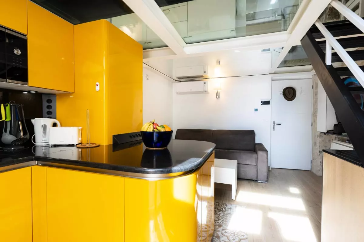 L'espace de vie se compose d'un salon chaleureux avec un canapé parfait pour la détente, d'une cuisine entièrement équipée avec four, micro-ondes, lave-vaisselle et machine à café, ainsi que d'un petit balcon privé. Pour vos nuits, vous profiterez d'une chambre élégante dotée d'un vrai lit double confortable et d'un dressing complet, complétée par une salle de bain moderne avec une grande douche et un sèche-cheveux.