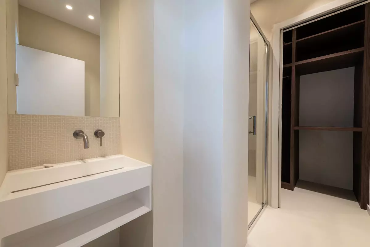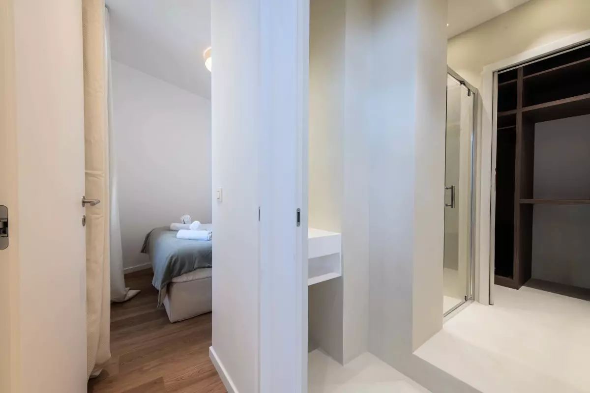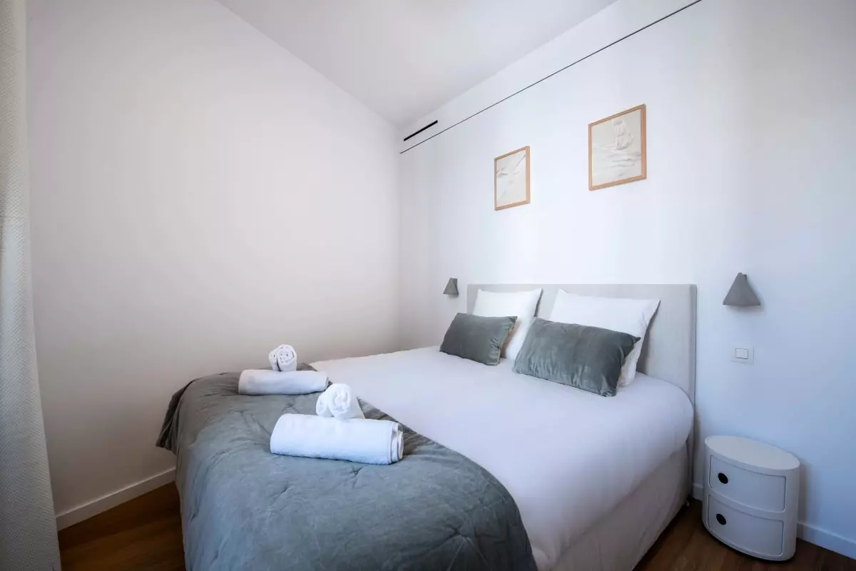 Côté nuit, la chambre accueille un lit queen size 160x200 cm, offrant un véritable confort. Des rangements intégrés permettent de s’installer sans encombrer l’espace.