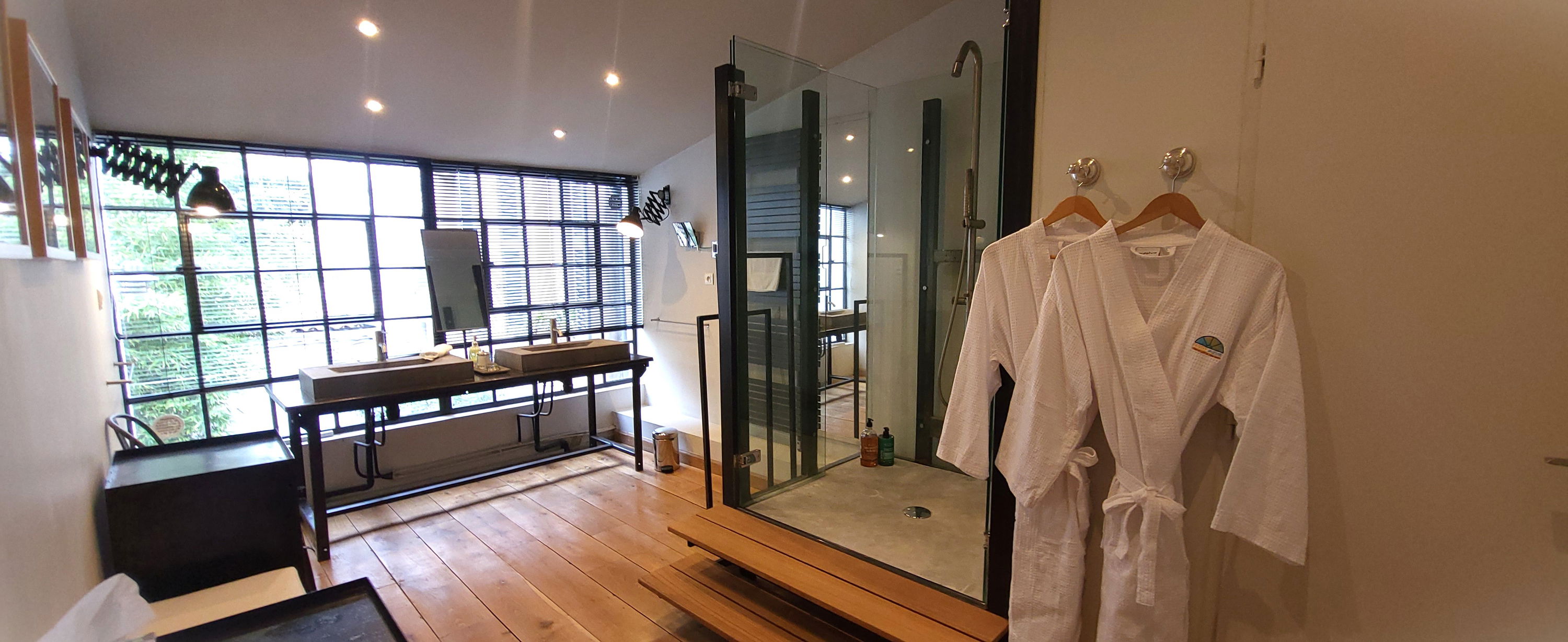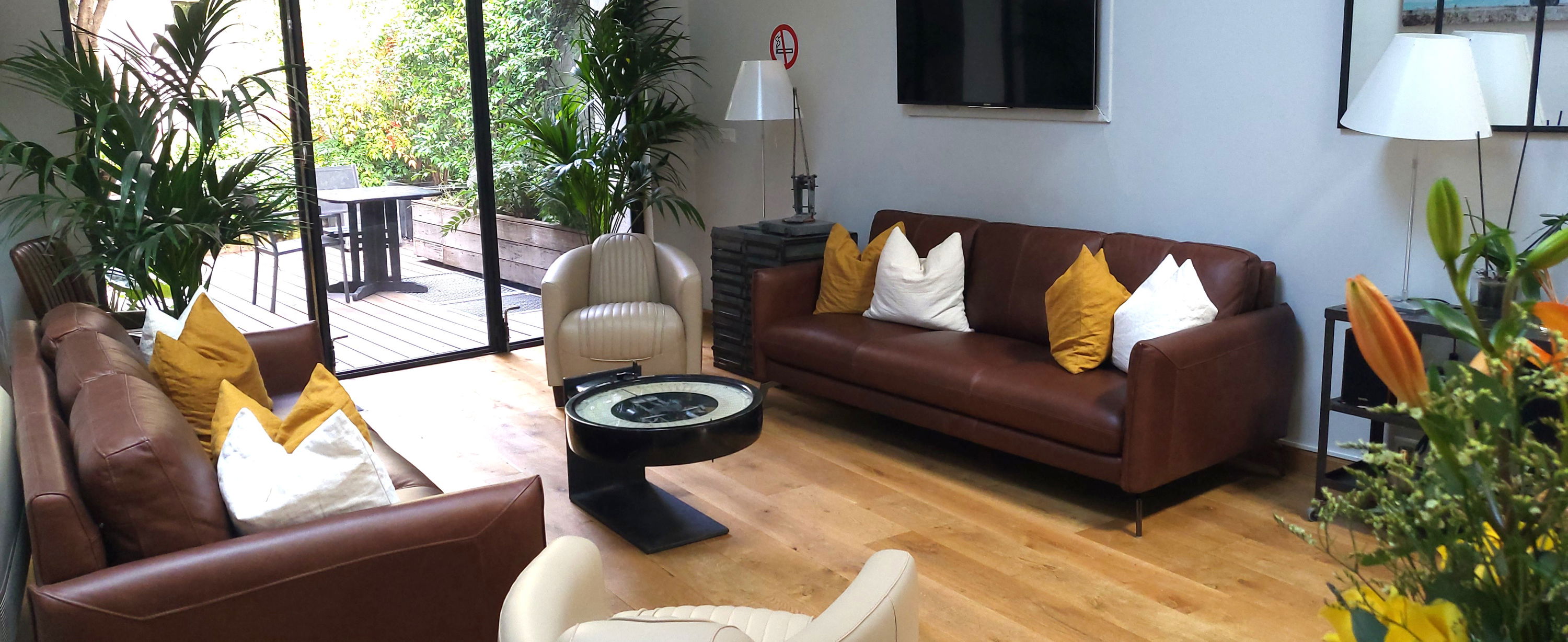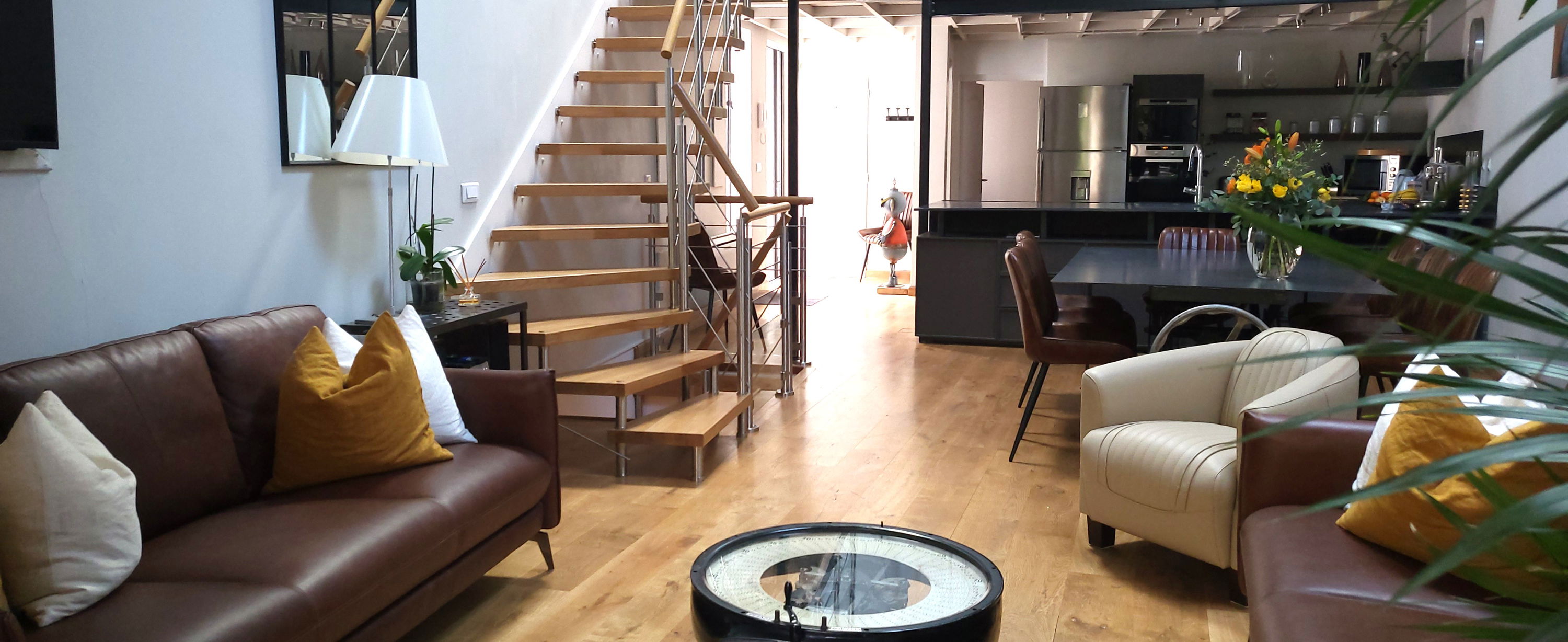 Le vaste séjour de 60 m², au style loft avec sa grande hauteur sous plafond, ouvre sur l’extérieur et constitue un lieu de vie lumineux et convivial.